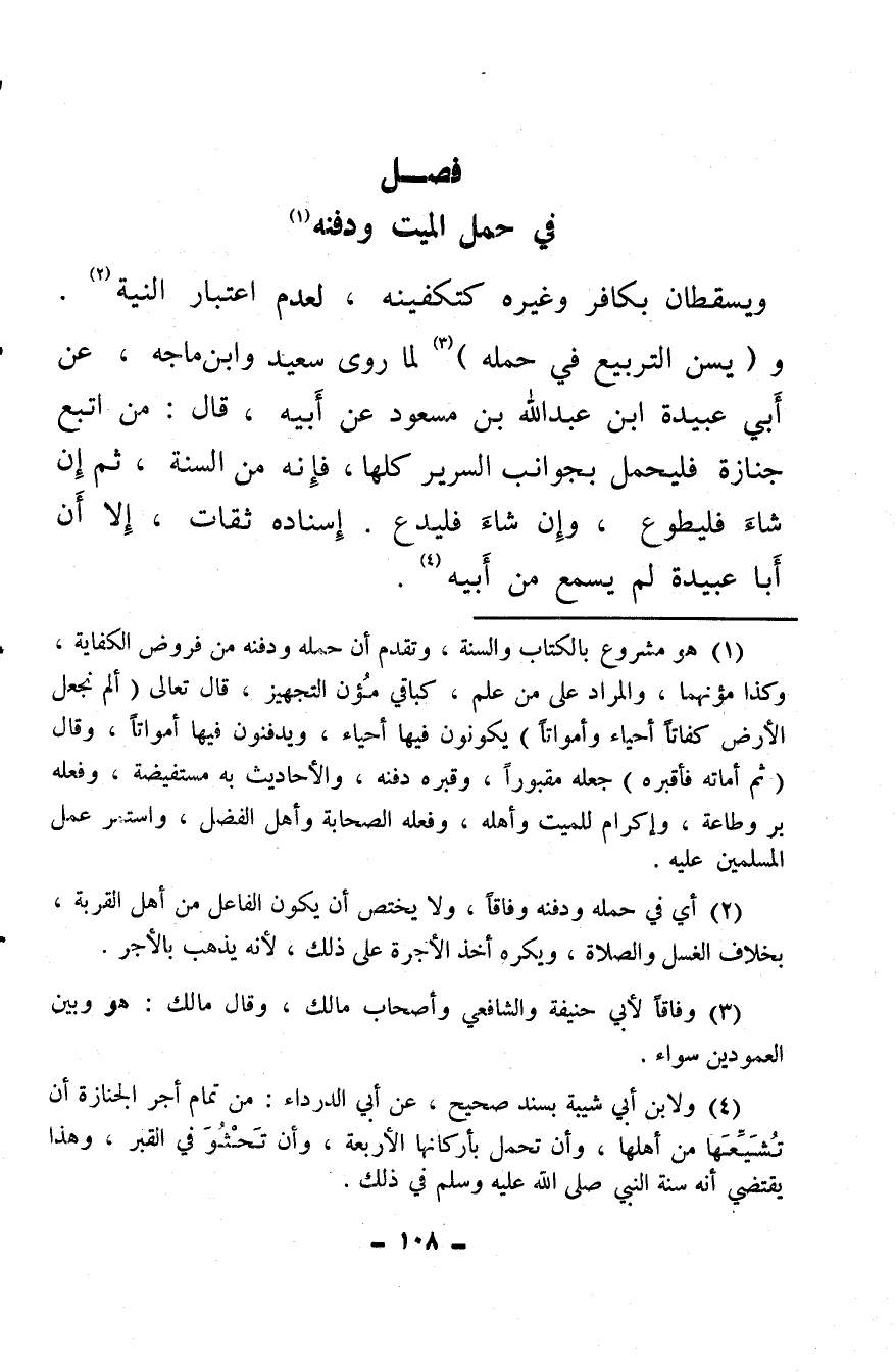 ويسقطان بكافر وغيره كتكفينه، لعدم اعتبار النية (¬2) . و (يسن التربيع في حمله) (¬3) لما روى سعيد وابن ماجه، عن أبي عبيدة بن عبد الله بن مسعود عن أبيه، قال: من اتبع جنازة فليحمل بجوانب السرير كلها، فإنه من السنة، ثم إن شاء فليطوع، وإن شاءَ فليدع. إسناده ثقات، إلا أن أبا عبيدة لم يسمع من أبيه (¬4) .