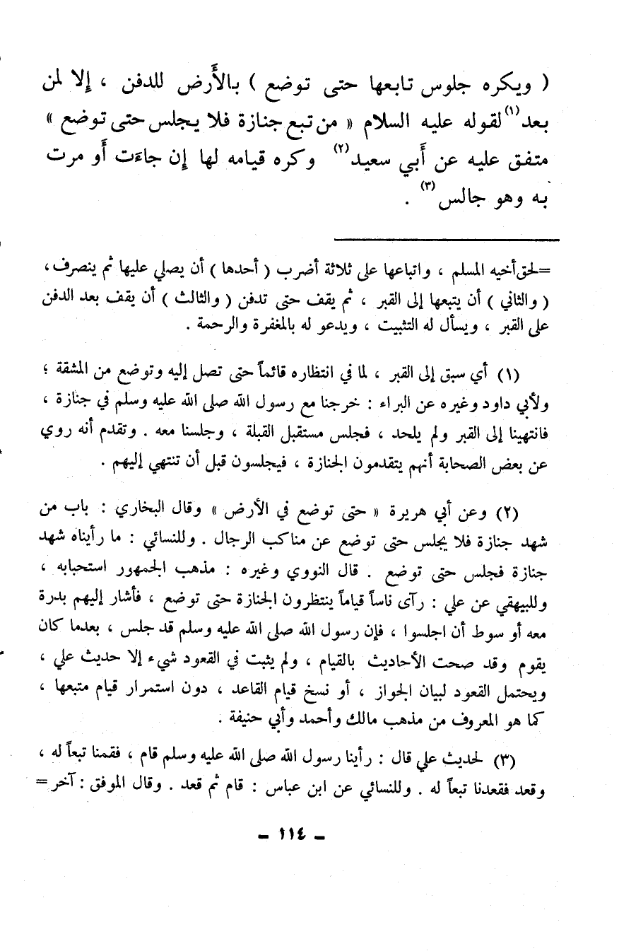 (¬2) وعن أبي هريرة «حتى توضع في الأرض» وقال البخاري: باب من شهد جنازة فلا يجلس حتى توضع عن مناكب الرجال. وللنسائي: ما رأيناه شهد جنازة فجلس حتى توضع. قال النووي وغيره: مذهب الجمهور استحبابه، وللبيهقي عن علي: رأى ناسًا قيامًا ينتظرون الجنازة حتى توضع، فأشار إليهم بدرة معه أو سوط أن اجلسوا، فإن رسول الله صلى الله عليه وسلم قد جلس، بعدما كان يقوم وقد صحت الأحاديث بالقيام، ولم يثبت في القعود شيء إلا حديث علي، ويحتمل القعود لبيان الجواز، أو نسخ قيام القاعد، دون استمرار قيام متبعها، كما هو المعروف من مذهب مالك وأحمد وأبي حنيفة.