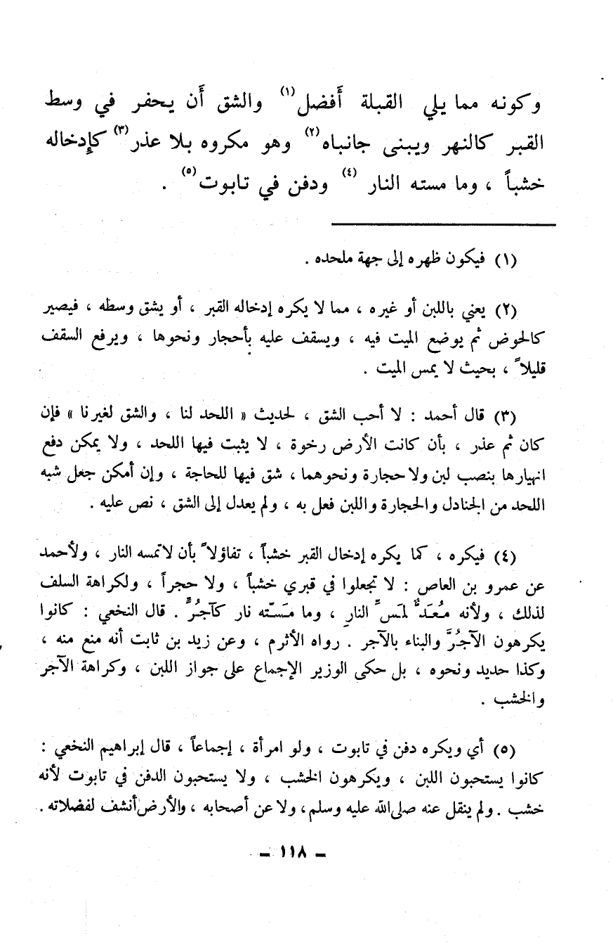 (¬5) أي ويكره دفن في تابوت، ولو امرأة، إجماعًا، قال إبراهيم النخعي: كانوا يستحبون اللبن، ويكرهون الخشب، ولا يستحبون الدفن في تابوت لأنه خشب. ولم ينقل عنه صلى الله عليه وسلم، ولا عن أصحابه، والأرض أنشف لفضلاته.