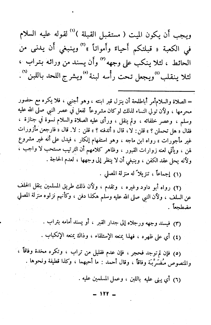 ويجب أن يكون الميت (مستقبل القبلة) (¬1) لقوله عليه السلام في الكعبة «قبلتكم أَحياءً وأَمواتًا» (¬2) وينبغي أن يدنى من الحائط، لئلا ينكب على وجهه (¬3) وأَن يسند من ورائه بتراب، لئلا ينقلب (¬4) ويجعل تحت رأسه لبنة (¬5) ويشرح اللحد باللبن (¬6) .