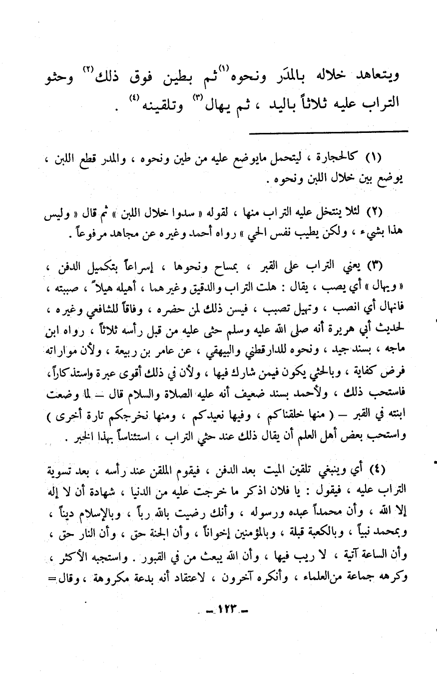(¬4) أي وينبغي تلقين الميت بعد الدفن، فيقوم الملقن عند رأسه، بعد تسوية التراب عليه، فيقول: يا فلان اذكر ما خرجت عليه من الدنيا، شهادة أن لا إله إلا الله، وأن محمدًا عبده ورسوله، وأنك رضيت بالله ربًا، وبالإسلام دينًا، وبمحمد نبيًا، وبالكعبة قبلة، وبالمؤمنين إخوانًا، وأن الجنة حق، وأن النار حق، وأن الساعة آتية، لا ريب فيها، وأن الله يبعث من في القبور. واستجبه الأكثر، وكرهه جماعة من العلماء، وأنكره آخرون، لاعتقاد أنه بدعة مكروهة، وقال