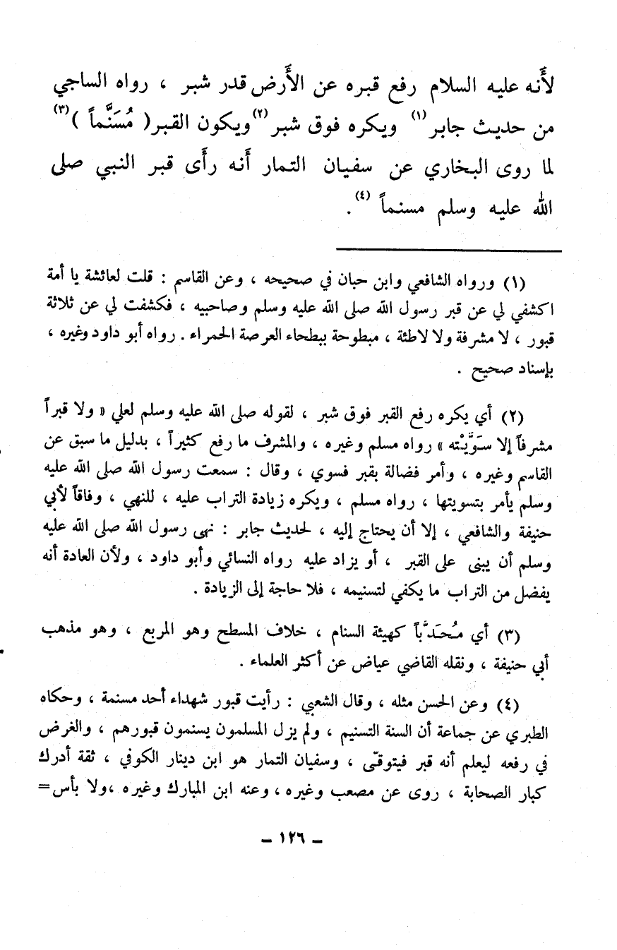 (¬2) أي يكره رفع القبر فوق شبر، لقوله صلى الله عليه وسلم لعلي «ولا قبرًا مشرفًا إلا سَوَّيته» رواه مسلم وغيره، والمشرف ما رفع كثيرًا، بدليل ما سبق عن القاسم وغيره، وأمر فضالة بقبر فسوي، وقال: سمعت رسول الله صلى الله عليه وسلم يأمر بتسويتها، رواه مسلم، ويكره زيادة التراب عليه، للنهي، وفاقًا لأبي حنيفة والشافعي، إلا أن يحتاج إليه، لحديث جابر: نهى رسول الله صلى الله عليه وسلم أن يبنى على القبر، أو يزاد عليه رواه النسائي وأبو داود، ولأن العادة أنه يفضل من التراب ما يكفي لتسنيمه، فلا حاجة إلى الزيادة.