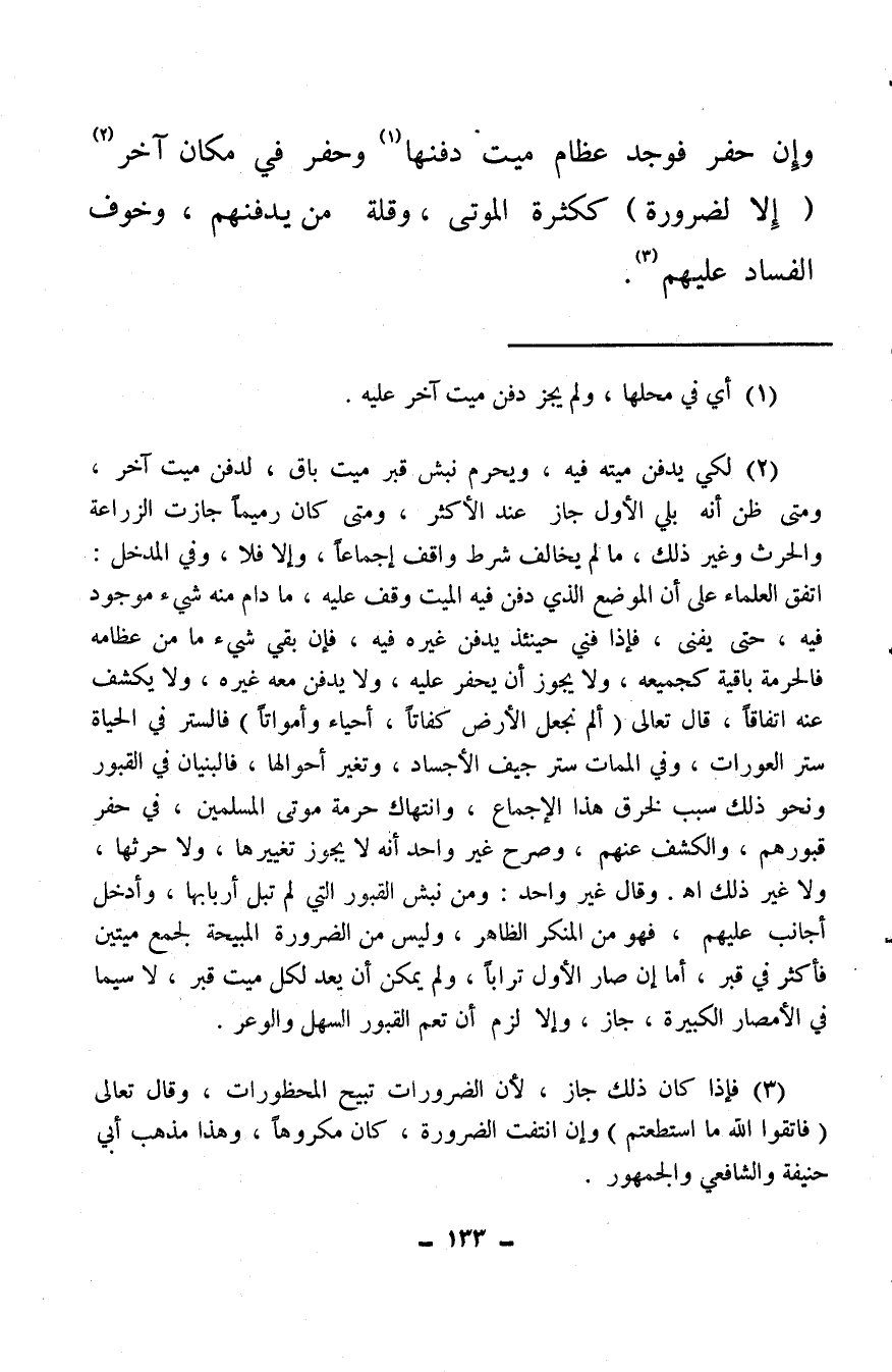 (¬2) لكي يدفن ميته فيه، ويحرم نبش قبر ميت باق، لدفن ميت آخر، ومتى ظن أنه بلي الأول جاز عند الأكثر، ومتى كان رميمًا جازت الزراعة والحرث وغير ذلك، ما لم يخالف شرط واقف إجماعًا، وإلا فلا، وفي المدخل: اتفق العلماء على أن الموضع الذي دفن فيه الميت وقف عليه، ما دام منه شيء موجود فيه، حتى يفنى، فإذا فني حينئذ يدفن غيره فيه، فإن بقي شيء ما من عظامه فالحرمة باقية كجميعه، ولا يجوز أن يحفر عليه، ولا يدفن معه غيره، ولا يكشف عنه اتفاقًا، قال تعالى {أَلَمْ نَجْعَلِ الأَرْضَ كِفَاتًا * أَحْيَاءً وَأَمْوَاتًا} فالستر في الحياة ستر العورات، وفي الممات ستر جيف الأجساد، وتغير أحوالها، فالبنيان في القبور ونحو ذلك سبب لخرق هذا الإجماع، وانتهاك حرمة موتى المسلمين، في حفر قبورهم، والكشف عنهم، وصرح غير واحد أنه لا يجوز تغييرها، ولا حرثها، ولا غير ذلك. اهـ. وقال غير واحد: ومن نبش القبور التي لم تبل أربابها، وأدخل أجانب عليهم، فهو من المنكر الظاهر، وليس من الضرورة المبيحة لجمع ميتين فأكثر في قبر، أما إن صار الأول ترابًا، ولم يمكن أن يعد لكل ميت قبر، لا سيما في الأمصار الكبيرة، جاز، وإلا لزم أن تعم القبور السهل والوعر.
