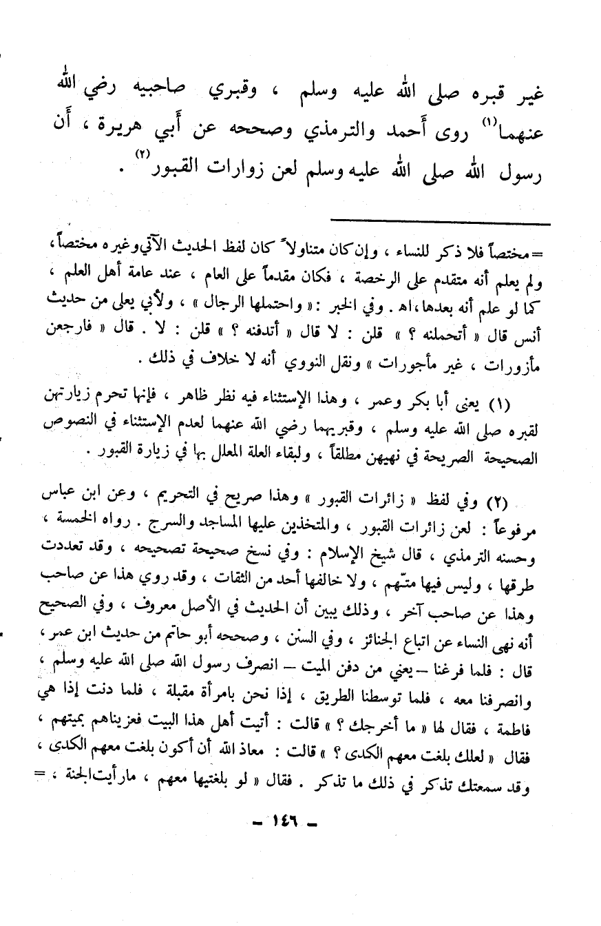 (¬2) وفي لفظ «زائرات القبور» وهذا صريح في التحريم، وعن ابن عباس مرفوعًا: لعن زائرات القبور، والمتخذين عليها المساجد والسرج. رواه الخمسة، وحسنه الترمذي، قال شيخ الإسلام: وفي نسخ صحيحة تصحيحه، وقد تعددت طرقها، وليس فيها متهم، ولا خالفها أحد من الثقات، وقد روي هذا عن صاحب وهذا عن صاحب آخر، وذلك يبين أن الحديث في الأصل معروف، وفي الصحيح أنه نهى النساء عن اتباع الجنائز، وفي السنن، وصححه أبو حاتم من حديث ابن عمر، قال: فلما فرغنا – يعني من دفن الميت – انصرف رسول الله صلى الله عليه وسلم، وانصرفنا معه، فلما توسطنا الطريق، إذا نحن بامرأة مقبلة، فلما دنت إذا هي فاطمة، فقال لها «ما أخرجك؟» قالت: أتيت أهل هذا البيت فعزيناهم بميتهم، فقال «لعلك بلغت معهم الكدى؟» قالت: معاذ الله أن أكون بلغت معهم الكدى، وقد سمعتك تذكر في ذلك ما تذكر. فقال «لو بلغتيها معهم، ما رأيت الجنة، حتى يراها جد أبيك» وقد فسر الكدى بالقبور، وبالأرض الصلبة، لأن مقابرهم كانت في مواضع صلبة، والنبي صلى الله عليه وسلم علل الإذن للرجال بأن ذلك يذكر بالموت، ويرقق القلب، ويدمع العين.