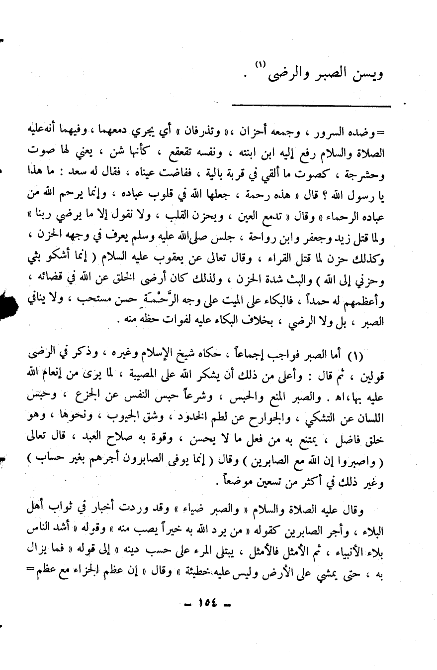 (¬1) أما الصبر فواجب إجماعًا، حكاه شيخ الإسلام وغيره، وذكر في الرضى قولين، ثم قال: وأعلى من ذلك أن يشكر الله على المصيبة، لما يرى من إنعام الله عليه بها، اهـ. والصبر المنع والحبس، وشرعًا حبس النفس عن الجزع، وحبس اللسان عن التشكي، والجوارح عن لطم الخدود، وشق الجيوب، ونحوها، وهو خلق فاضل، يمتنع به من فعل ما لا يحسن، وقوة به صلاح العبد، قال تعالى {وَاصْبِرُوا إِنَّ اللهَ مَعَ الصَّابِرِينَ} وقال {إِنَّمَا يُوَفَّى الصَّابِرُونَ أَجْرَهُمْ بِغَيْرِ حِسَابٍ} وغير ذلك في أكثر من تسعين موضعًا.