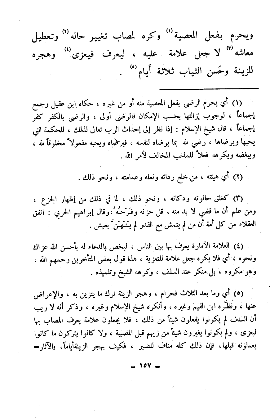 ويحرم بفعل المعصية (¬1) وكره لمصاب تغيير حاله (¬2) وتعطيل معاشه (¬3) لا جعل علامة عليه، ليعرف فيعزى (¬4) وهجره للزينة وحَسن الثياب ثلاثة أيام (¬5) .