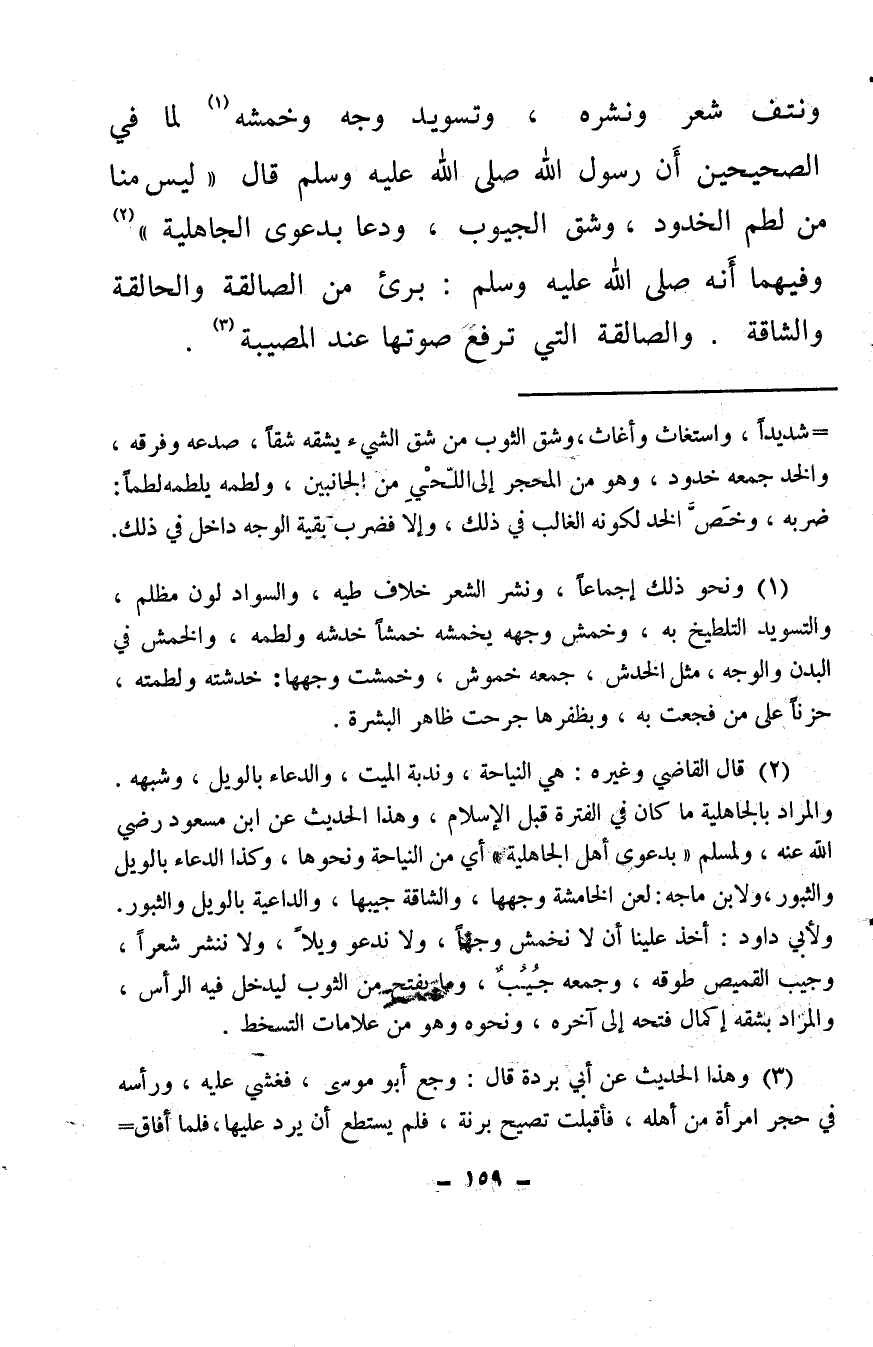 (¬3) وهذا الحديث عن أبي بردة قال: وجع أبو موسى، فغشي عليه، ورأسه في حجر امرأة من أهله، فأقبلت تصيح برنة، فلم يستطيع أن يرد عليها، فلما أفاق قال: أنا بريء مما برئ منه رسول الله صلى الله عليه وسلم، إنه برئ من الصالقة الحديث، والصالقة بالصاد المهملة والقاف، ويقال بالسين والقاف، والحالقة التي تحلق شعرها عند المصيبة، والشاقة التي تشق ثيابها عند المصيبة، قال النووي وغيره: هذا المشهور المعروف، وقال آخرون: الصلق بضرب الوجه، وفي رواية «أنا بريء ممن حلق وسلق وخرق» والسلق والصلق الصوت الشديد، وإنما نهي عن ذلك لما فيه من إظهار الجزع، وعدم الرضا بقضاء الله، والتسخط من فعله، وفي شق الجيوب أيضًا إفساد للمال من غير حاجة.