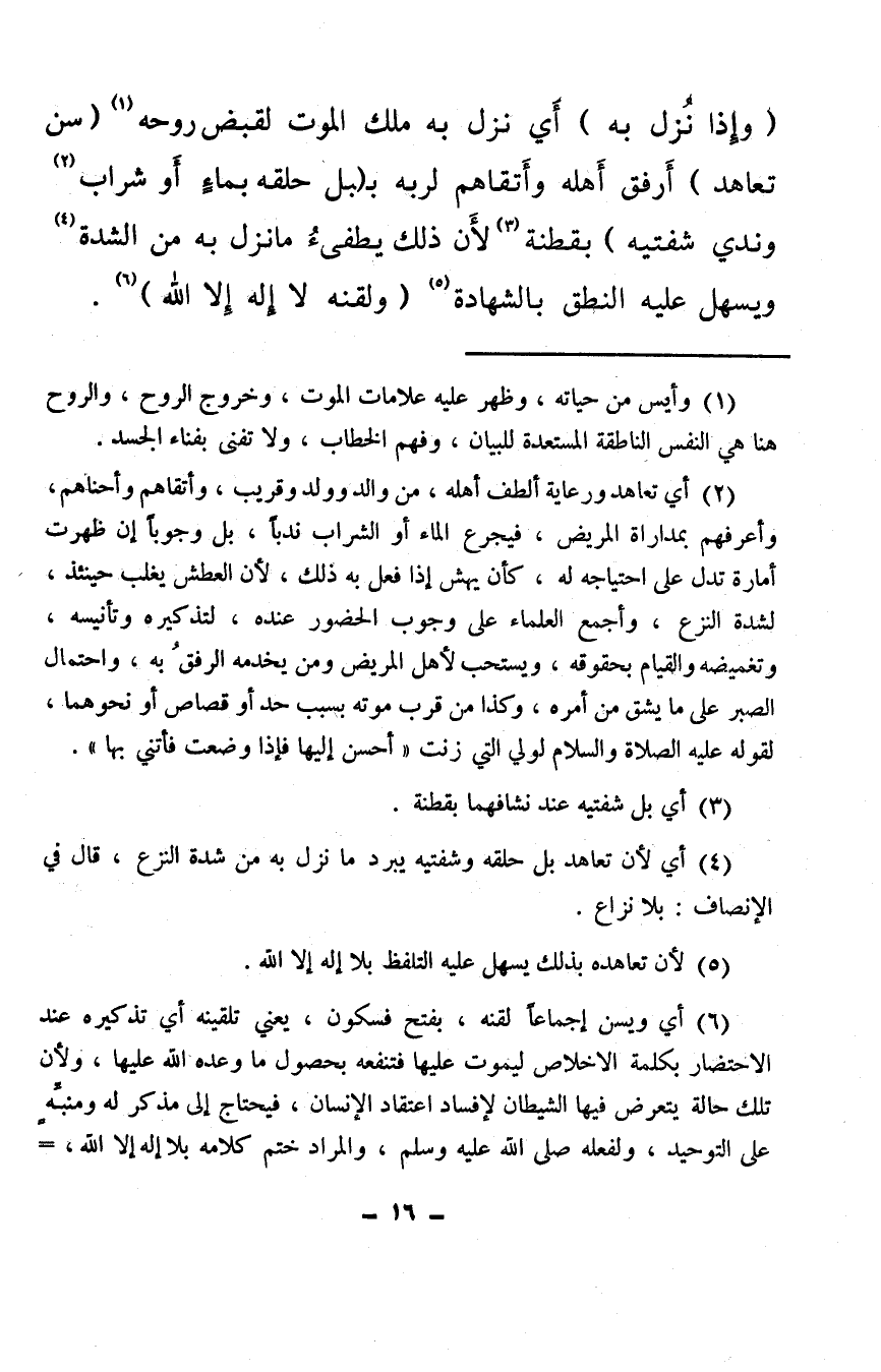 (¬6) أي ويسن إجماعًا لقنه، بفتح فسكون، يعني أي تذكيره عند الاحتضار بكلمة الإخلاص ليموت عليها فتنفعه بحصول ما وعده الله عليها، ولأن تلك الحالة يتعرض فيها الشيطان لإفساد اعتقاد الإنسان، فيحتاج إلى مذكر له ومنبه على التوحيد، ولفعله صلى الله عليه وسلم، والمراد ختم كلامه بلا إله إلا الله،