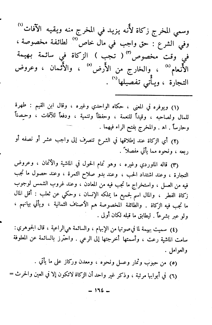 وسمي المخرج زكاة لأَنه يزيد في المخرج منه ويقيه الآفات (¬1) وفي الشرع: حق واجب في مال خاص (¬2) لطائفة مخصوصة، في وقت مخصوص (¬3) (تجب) الزكاة في سائمة بهيمة الأنعام (¬4) ، والخارج من الأرض (¬5) ، والأَثمان، وعروض التجارة، ويأْتي تفصيلها (¬6) .