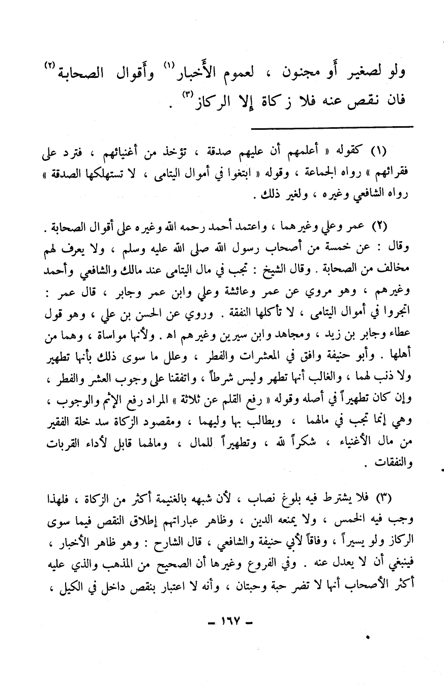 (¬2) عمر وعلي وغيرهما، واعتمد أحمد رحمه الله وغيره على أقوال الصحابة. وقال: عن خمسة من أصحاب رسول الله صلى الله عليه وسلم، ولا يعرف لهم مخالف من الصحابة. وقال الشيخ: تجب في مال اليتامى عند مالك والشافعي وأحمد وغيرهم، وهو مروي عن عمر وعائشة وعلي وابن عمر وجابر، قال عمر: اتجروا في أموال اليتامى، لا تأكلها النفقة. وروي عن الحسن بن علي، وهو قول عطاء وجابر بن زيد، ومجاهد وابن سيرين وغيرهم. اهـ. ولأنها مواساة، وهما من أهلها. وأبو حنيفة وافق في المعشرات والفطر، وعلل ما سوى ذلك بأنها تطهير ولا ذنب لهما، والغالب أنها تطهر وليس شرطًا، واتفقنا على وجوب العشر والفطر، وإن كان تطهيرًا في أصله وقوله «رفع القلم عن ثلاثة» المراد رفع الإثم والوجوب، وهي إنما تجب في مالهما، ويطالب بها وليهما، ومقصود الزكاة سد خلة الفقير في مال الأغنياء، شكرًا لله، وتطهيرًا للمال، ومالهما قابل لأداء القربات والنفقات.