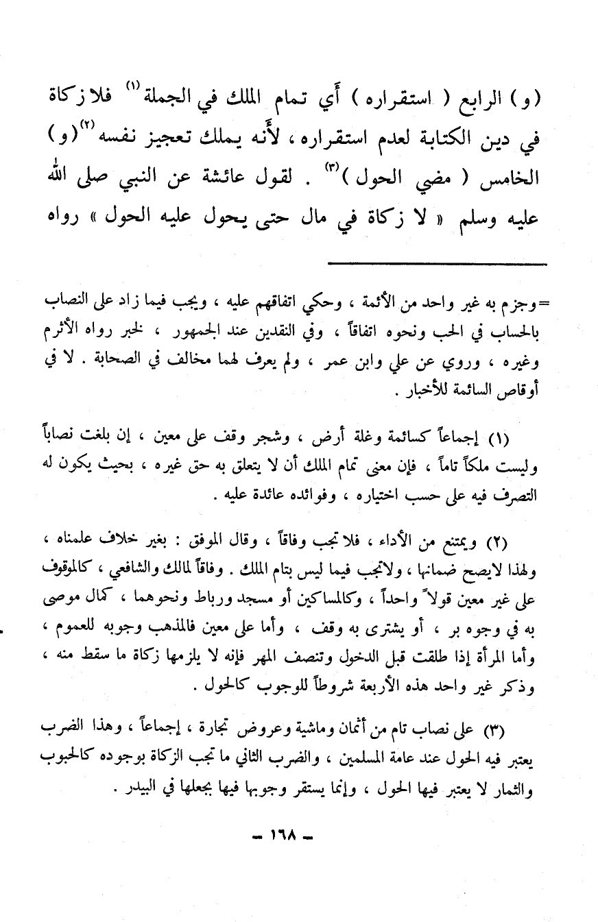 (¬3) على نصاب تام من أثمان وماشية وعروض تجارة، إجماعًا، وهذا الضرب يعتبر فيه الحول عند عامة المسلمين، والضرب الثاني ما تجب الزكاة بوجوده كالحبوب والثمار لا يعتبر فيها الحول، وإنما يستقر وجوبها فيها بجعلها في البيدر.
