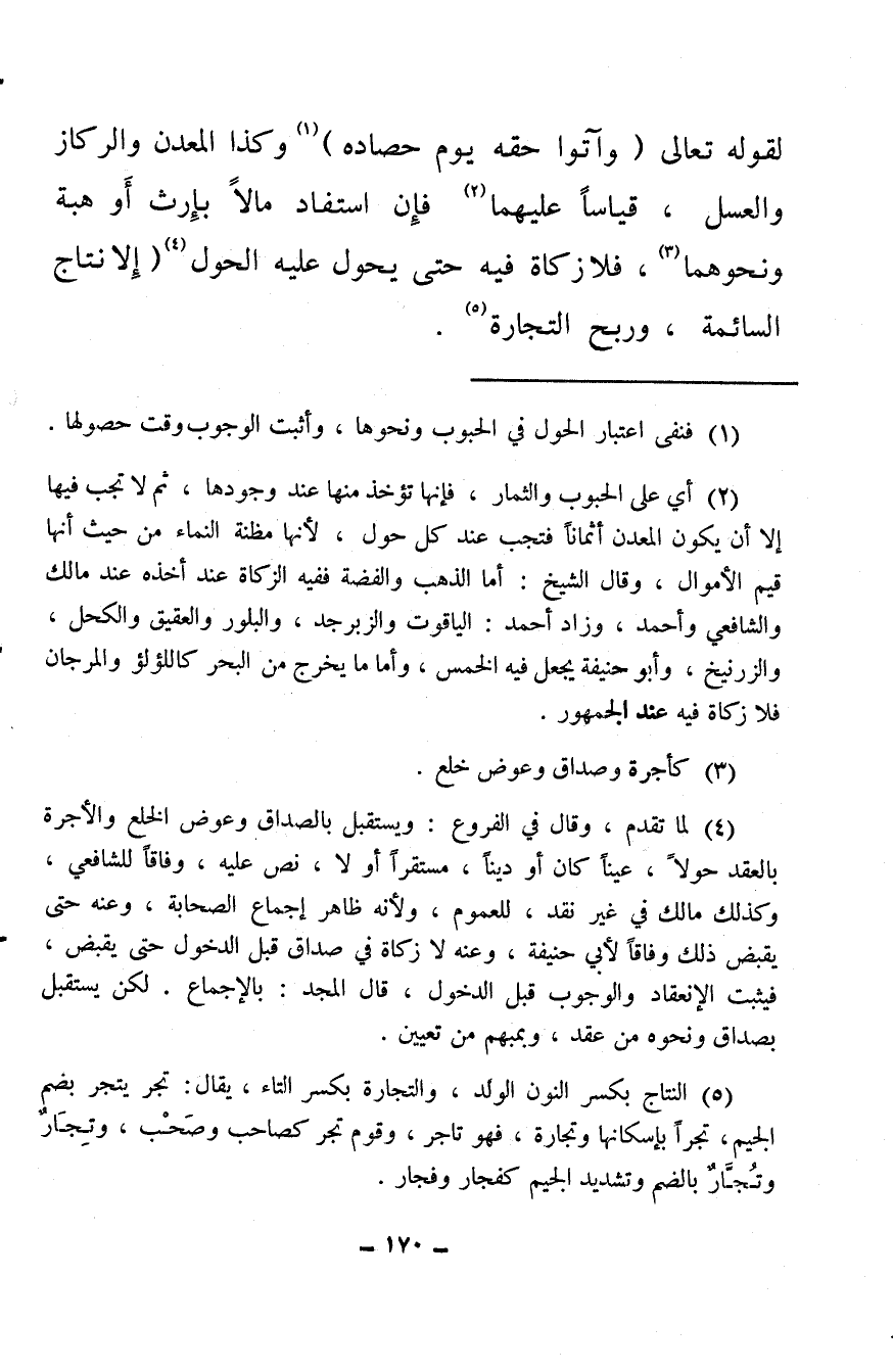(¬2) أي على الحبوب والثمار، فإنها تؤخذ منها عند وجودها، ثم لا تجب فيها إلا أن يكون المعدن أثمانًا فتجب عند كل حول، لأنها مظنة النماء من حيث أنها قيم الأموال، وقال الشيخ: أما الذهب والفضة ففيه الزكاة عند أخذه عند مالك والشافعي وأحمد، وزاد أحمد: الياقوت والزبرجد، والبلور والعقيق والكحل، والزرنيخ، وأبو حنيفة يجعل فيها الخمس، وأما ما يخرج من البحر كاللؤلؤ والمرجان فلا زكاة فيه عند الجمهور.