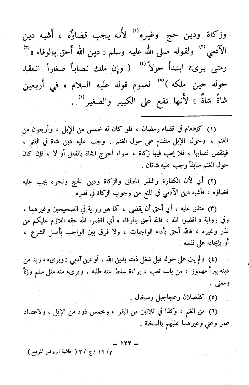وزكاة ودين حج وغيره (¬1) لأنه يجب قضاؤه، أشبه دين الآدمي (¬2) ولقوله صلى الله عليه وسلم «دين الله أحق بالوفاء» (¬3) ومتى برئ ابتدأ حولاً (¬4) (وإن ملك نصابًا صغارًا انعقد حوله حين ملكه) (¬5) لعموم قوله عليه السلام «في أربعين شاةً شاةٌ» لأنها تقع على الكبير والصغير (¬6) .