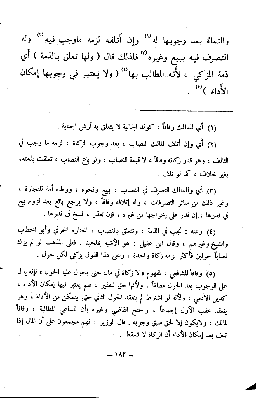 (¬5) وفاقًا للشافعي، لمفهوم «لا زكاة في مال حتى يحول عليه الحول» فإنه يدل على الوجوب بعد الحول مطلقًا، ولأنها حق للفقير، فلم يعتبر فيها إمكان الأداء، كدين الآدمي، ولأنه لو اشترط لم ينعقد الحول الثاني حتى يتمكن من الأداء، وهو ينعقد عقب الأول إجماعًا، واحتج القاضي وغيره بأن للساعي المطالبة، وفاقًا لمالك، ولا يكون إلا لحق سبق وجوبه.