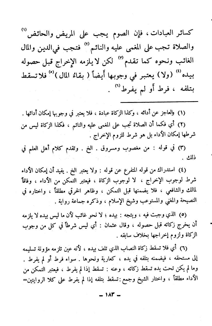 كسائر العبادات، فإن الصوم يجب على المريض والحائض (¬1) والصلاة تجب على المغمي عليه والنائم (¬2) فتجب في الدين والمال الغائب ونحوه كما تقدم (¬3) لكن لا يلزمه الإخراج قبل حصوله بيده (¬4) (ولا) يعتبر في وجوبها أيضًا (بقاءُ المال) (¬5) فلا تسقط بتلفه، فرط أو لم يفرط (¬6) .
