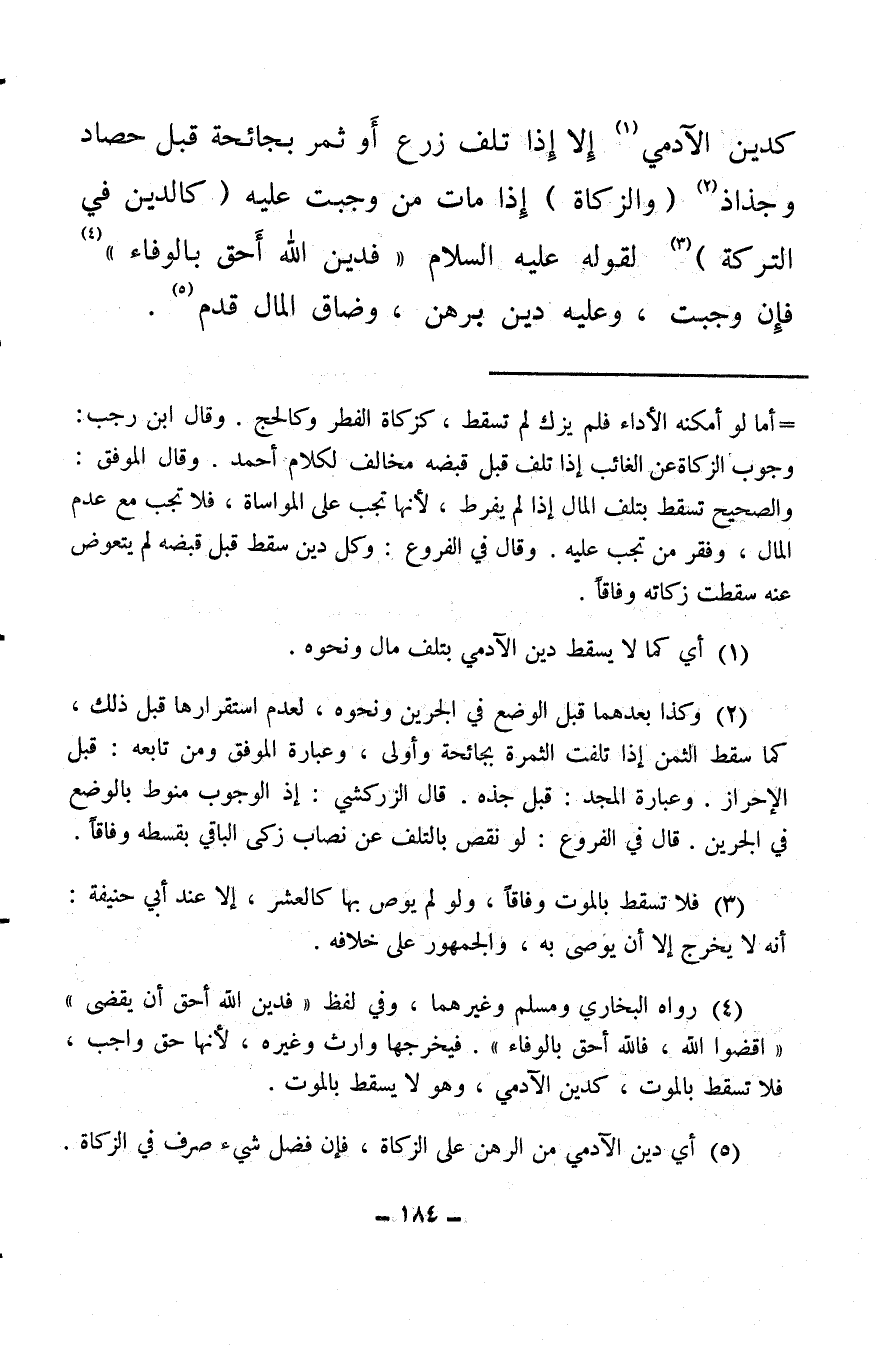 كدين الآدمي (¬1) إلا إذا تلف زرع أو ثمر بجائحة قبل حصاد وجذاذ (¬2) (والزكاة) إذا مات من وجبت عليه (كالدين في التركة) (¬3) لقوله عليه السلام «فدين الله أحق بالوفاء» (¬4) فإن وجبت، وعليه دين برهن، وضاق المال قدم (¬5) .