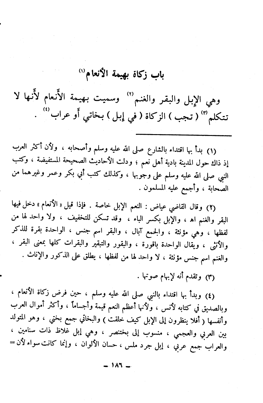 (¬1) بدأ بها اقتداء بالشارع صلى الله عليه وسلم وأصحابه، ولأن أكثر العرب إذ ذاك حول المدينة بادية أهل نعم؛ ودلت الأحاديث الصحيحة المستفيضة، وكتب النبي صلى الله عليه وسلم على وجوبها، وكذلك كتب أبي بكر وعمر وغيرهما من الصحابة، وأجمع عليه المسلمون.