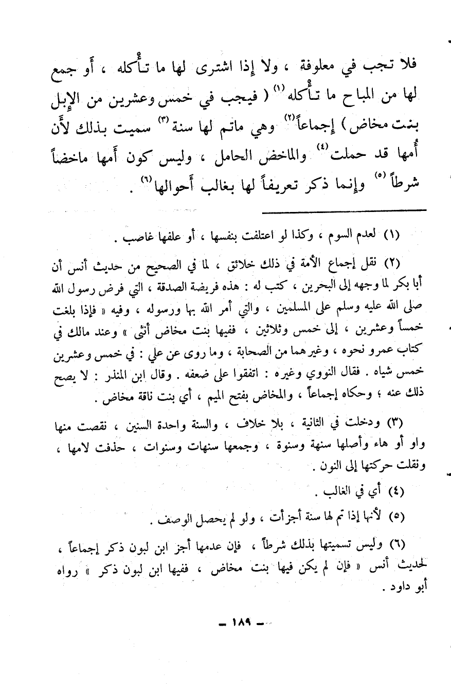 (¬2) نقل إجماع الأمة في ذلك خلائق، لما في الصحيح من حديث أنس أن أبا بكر لما وجهه إلى البحرين، كتب له: هذه فريضة الصدقة، التي فرض رسول الله صلى الله عليه وسلم على المسلمين، والتي أمر الله بها ورسوله، وفيه «فإذا بلغت خمسًا وعشرين، إلى خمس وثلاثين، ففيها بنت مخاض أنثى» وعند مالك في كتاب عمرو نحوه، وغيرهما من الصحابة، وما روى عن علي: في خمس وعشرين خمس شياه. فقال النووي وغيره: اتفقوا على ضعفه. وقال ابن المنذر: لا يصح ذلك عنه؛ وحكاه إجماعًا، والمخاض بفتح الميم، أي بنت ناقة مخاض.