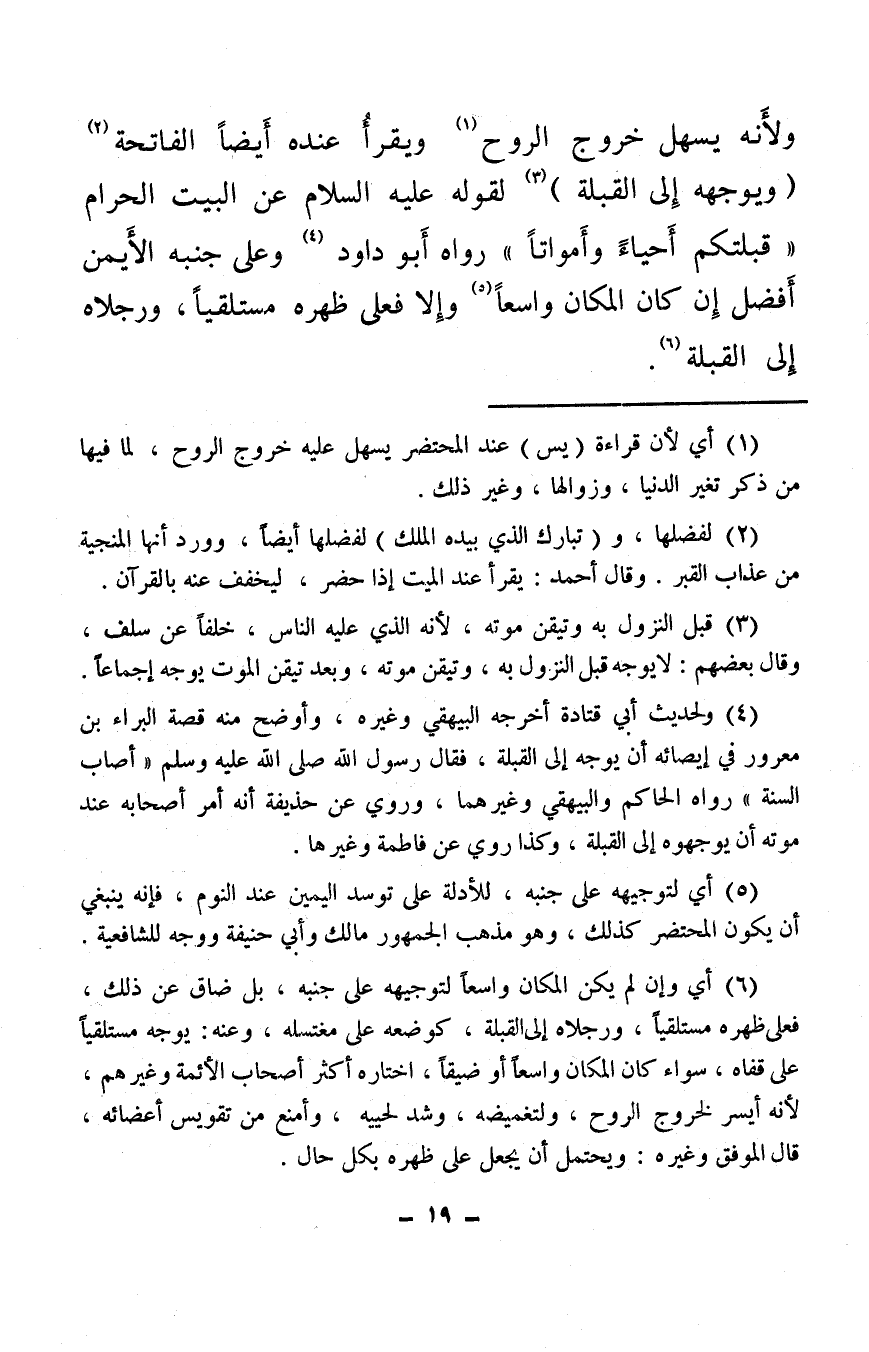 (¬5) أي لتوجيهه على جنبه، للأدلة على توسد اليمين عند النوم، فإنه ينبغي أن يكون المحتضر كذلك، وهو مذهب الجمهور مالك وأبي حنيفة ووجه للشافعية.