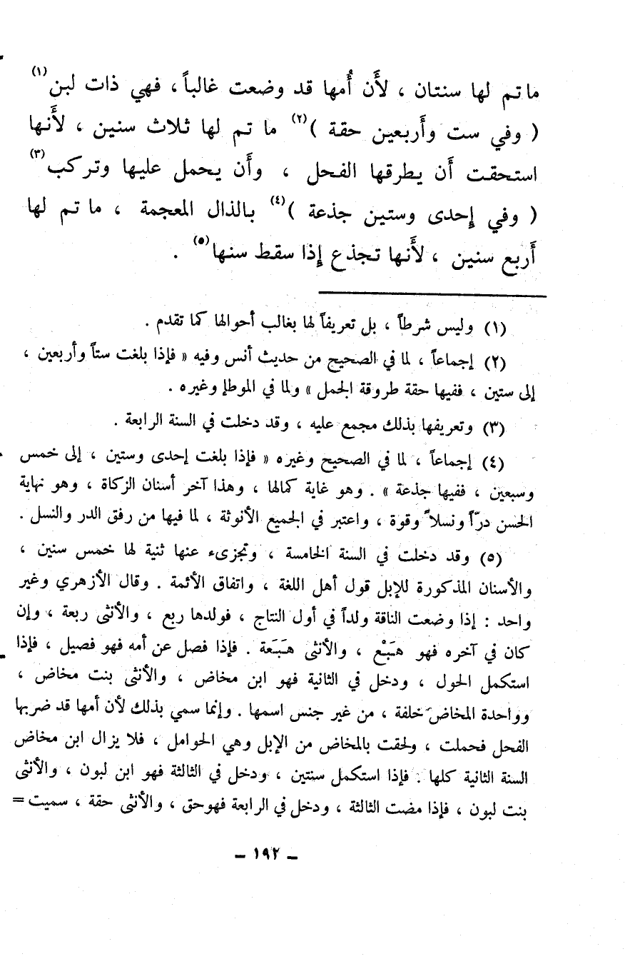 (¬5) وقد دخلت في السنة الخامسة، وتجزئ عنها ثنية لها خمس سنين، والأسنان المذكورة للإبل قول أهل اللغة، واتفاق الأئمة. وقال الأزهري وغير واحد: إذا وضعت الناقة ولدًا في أول النتاج، فولدها ربع، والأنثى ربعة، وإن كان في آخره فهو هَبْع، والأنثى هَبَعة. فإذا فصل عن أمه فهو فصيل، فإذا استكمل الحول، ودخل في الثانية فهو ابن مخاض، والأنثى بنت مخاض، وواحدة المخاض خلفة، من غير جنس اسمها. وإنما سمي بذلك لأن أمها قد ضربها الفحل فحملت، ولحقت بالمخاض من الإبل وهي الحوامل، فلا يزال ابن مخاض السنة الثانية كلها. فإذا استكمل سنتين، ودخل في الثالثة فهو ابن لبون، والأنثى بنت لبون، فإذا مضت الثالثة، ودخل في الرابعة فهو حق، والأنثى حقة، سميت