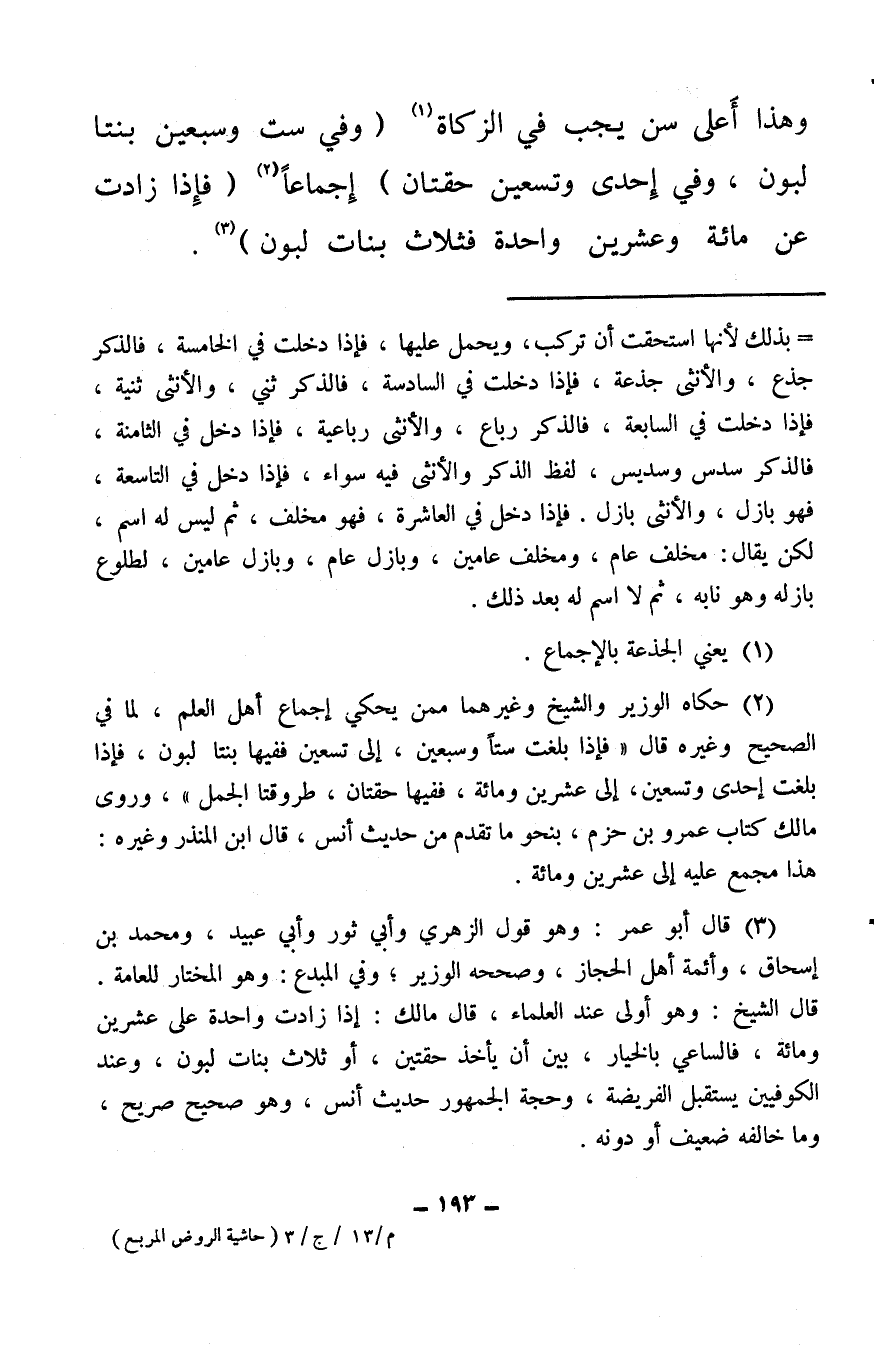 (¬2) حكاه الوزير والشيخ وغيرهما ممن يحكي إجماع أهل العلم، لما في الصحيح وغيره قال «فإذا بلغت ستًا وسبعين، إلى تسعين ففيها بنتا لبون، فإذا بلغت إحدى وتسعين، إلى عشرين ومائة، ففيها حقتان، طروقتا الجمل» ، وروى مالك كتاب عمرو بن حزم، بنحو ما تقدم من حديث أنس، قال ابن المنذر وغيره: هذا مجمع عليه إلى عشرين ومائة.