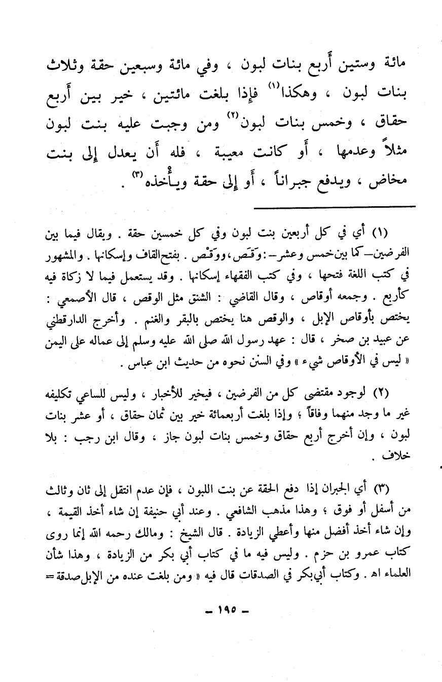 (¬1) أي في كل أربعين بنت لبون وفي كل خمسين حقة. ويقال فيما بين الفرضين – كما بين خمس وعشر -: وَقَص، ووَقْص. بفتح القاف وإسكانها. والمشهور في كتب اللغة فتحها، وفي كتب الفقهاء إسكانها. وقد يستعمل فيما لا زكاة فيه كأربع. وجمعه أوقاص، وقال القاضي: الشنق مثل الوقص، قال الأصمعي: يختص بأوقاص الإبل، والوقص هنا يختص بالبقر والغنم. وأخرج الدارقطني عن عبيد بن صخر، قال: عهد رسول الله صلى الله عليه وسلم إلى عماله على اليمن «ليس في الأوقاص شيء» وفي السنن نحوه من حديث ابن عباس.
