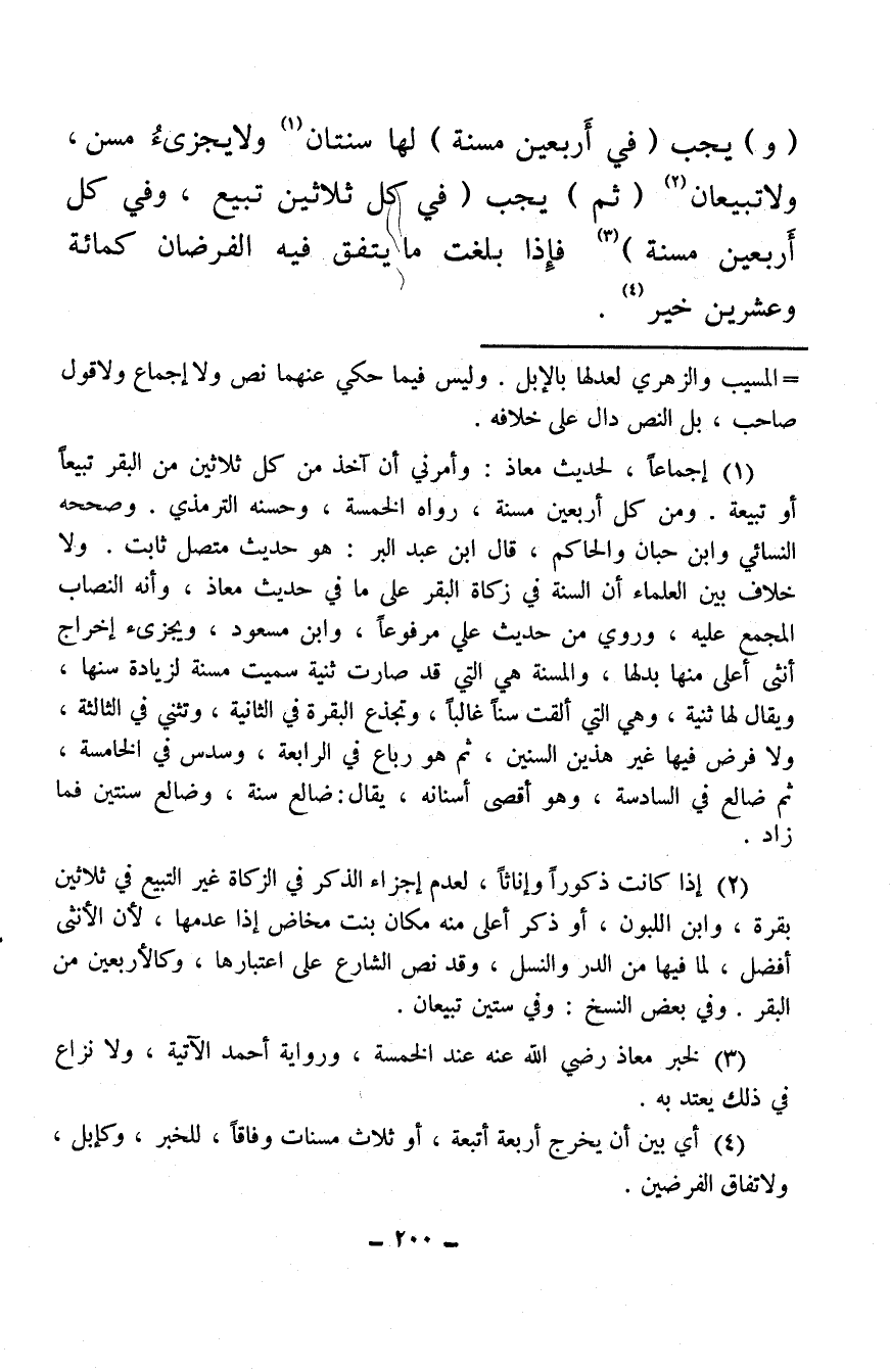 (¬1) إجماعًا، لحديث معاذ: وأمرني أن آخذ من كل ثلاثين من البقر تبيعًا أو تبيعة. ومن كل أربعين مسنة، رواه الخمسة، وحسنه الترمذي. وصححه النسائي وابن حبان والحاكم، قال ابن عبد البر: هو حديث متصل ثابت. ولا خلاف بين العلماء أن السنة في زكاة البقر على ما في حديث معاذ، وأنه النصاب المجمع عليه، وروي من حديث علي مرفوعًا، وابن مسعود، ويجزئ إخراج أنثى أعلى منها بدلها، والمسنة هي التي قد صارت ثنية سميت مسنة لزيادة سنها، ويقال لها ثنية، وهي التي ألقت سنًا غالبًا، وتجذع البقرة في الثانية، وتثني في الثالثة، ولا فرض فيها غير هذين السنين، ثم هو رباع في الرابعة، وسدس في الخامسة، ثم ضالع في السادسة، وهو أقصى أسنانه، يقال: ضالع سنة، وضالع سنتين فما زاد.
