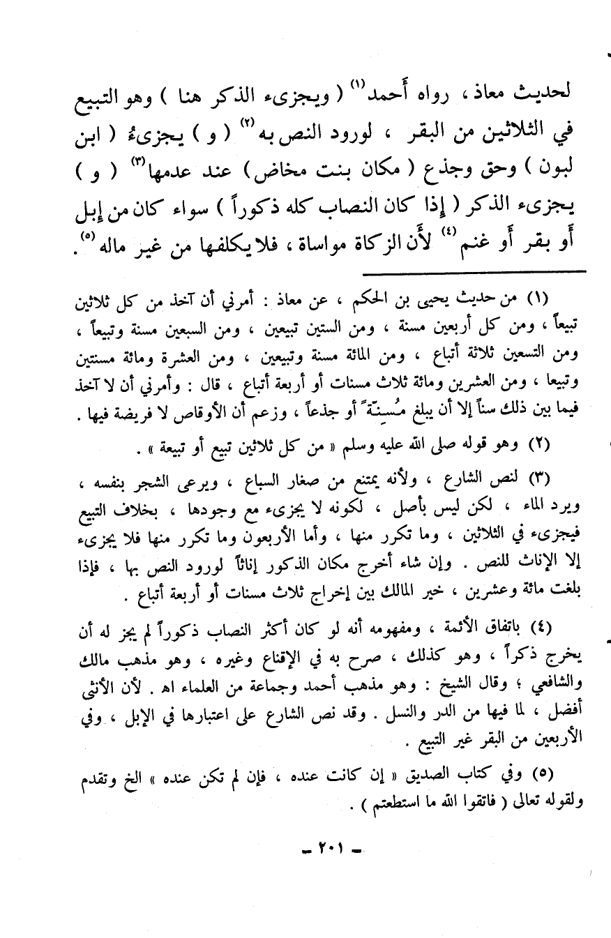 (¬1) من حديث يحيى بن الحكم، عن معاذ: أمرني أن آخذ من كل ثلاثين تبيعًا، ومن كل أربعين مسنة، ومن الستين تبيعين، ومن السبعين مسنة وتبيعًا، ومن التسعين ثلاثة أتباع، ومن المائة مسنة وتبيعين، ومن العشرة ومائة مسنتين وتبيعا، ومن العشرين ومائة ثلاث مسنات أو أربعة أتباع، قال: وأمرني أن لا آخذ فيما بين ذلك سنًا إلا أن يبلغ مُسِنّةً أو جذعًا، وزعم أن الأوقاص لا فريضة فيها.