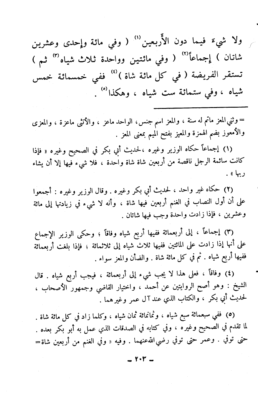 (¬3) إجماعًا، إلى أربعمائة ففيها أربع شياه وفاقًا؛ وحكى الوزير الإجماع على أنها إذا زادت على المائتين ففيها ثلاث شياه إلى ثلاثمائة؛ فإذا بلغت أربعمائة ففيها أربع شياه. ثم في كل مائة شاة. والضأن والمعز سواء.