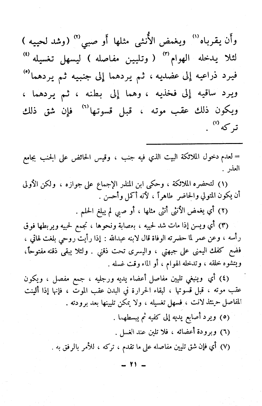 (¬3) أي ويسن إذا مات شد لحييه، بعصابة ونحوها، تجمع لحييه ويربطها فوق رأسه، وعن عمر لما حضرته الوفاة قال لابنه عبد الله: إذا رأيت روحي بلغت لهاتي، فضع كفك اليمنى على جبهتي، واليسرى تحت ذقني. ولئلا يبقى ذقنه مفتوحًا, ويتشوه خلقه، وتدخله الهام، أو الماء وقت غسله.