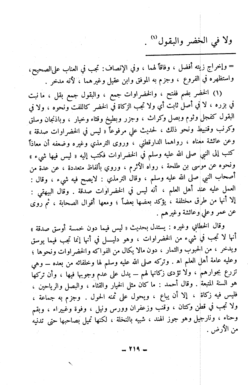 (¬1) الخضر بضم ففتح، والخضروات جمع، والبقول جمع بقل، ما نبت في بزره، لا في أصل ثابت أي ولا تجب الزكاة في الخضر كاللفت ونحوه، ولا في البقول كفجل وثوم وبصل وكراث، وجزر وبطيخ وقثاء وخيار، وباذنجان وسلق وكرنب وقنبيط ونحو ذلك، لحديث علي مرفوعًا «ليس في الخضراوات صدقة» وعن عائشة معناه، رواهما الدارقطني، وروى الترمذي وغيره وضعفه أن معاذًا كتب إلى النبي صلى الله عليه وسلم في الخضراوات فكتب إليه «ليس فيها شيء» ونحوه عن موسى بن طلحة، رواه الأثرم، وروي بألفاظ متعددة، عن عدة من أصحاب النبي صلى الله عليه وسلم، وقال الترمذي: لا يصح فيه شيء، وقال: العمل عليه عند أهل العلم، أنه ليس في الخضروات صدقة. وقال البيهقي: إلا أنها من طرق مختلفة، يؤكد بعضها بعضًا؛ ومعها أقوال الصحابة، ثم روى عن عمر وعلي وعائشة وغيرهم.