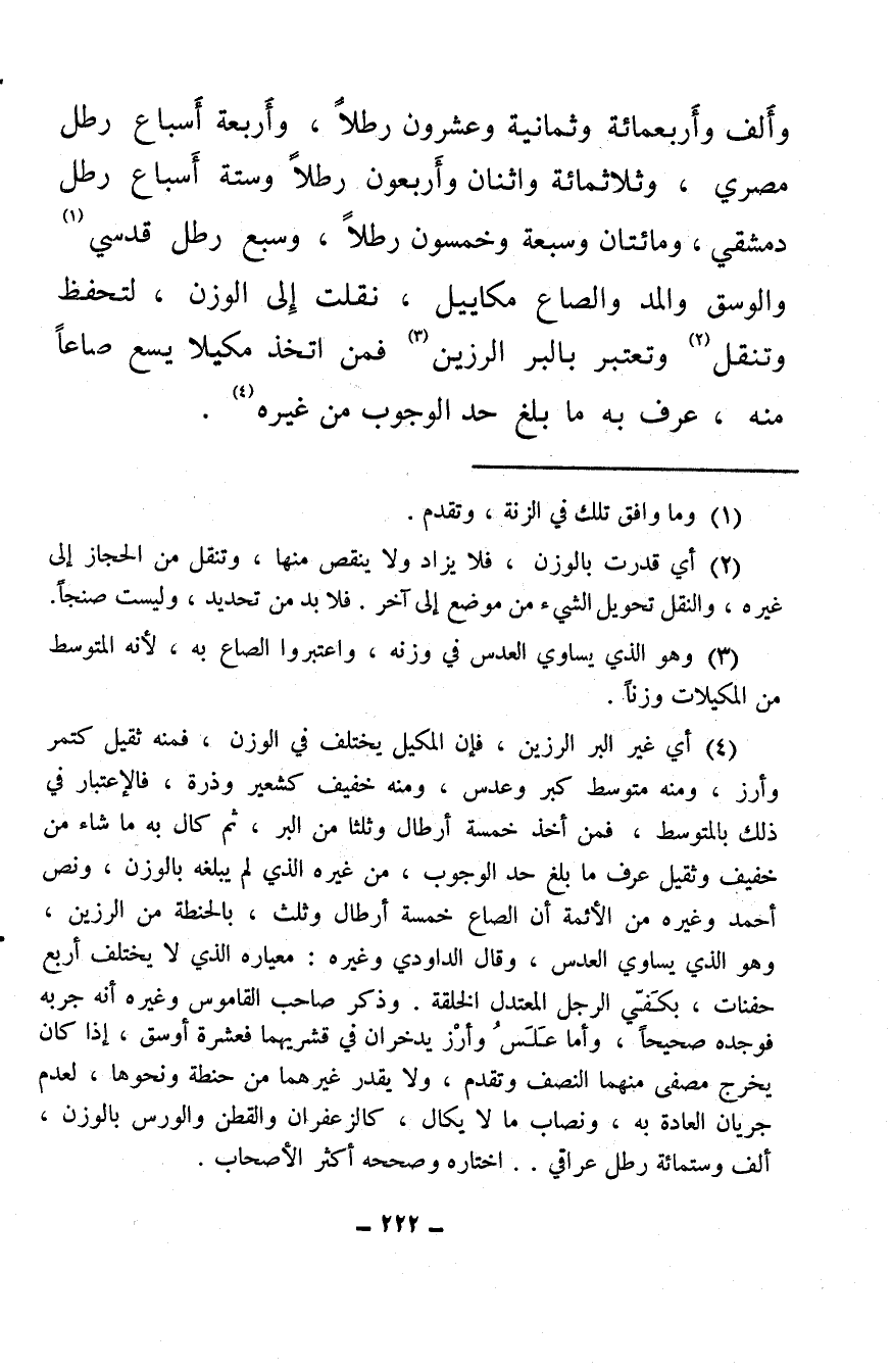 وألف وأربعمائة وثمانية وعشرون رطلاً، وأربعة أسباع رطل مصري، وثلاثمائة واثنان وأربعون رطلاً وستة أسباع رطل دمشقي، ومائتان وسبعة وخمسون رطلاً، وسبع رطل قدسي (¬1) والوسق والمد والصاع مكاييل، نقلت إلى الوزن، لتحفظ وتنقل (¬2) وتعتبر بالبر الرزين (¬3) فمن اتخذ مكيلا يسع صاعًا منه، عرف به ما بلغ حد الوجوب من غيره (¬4) .