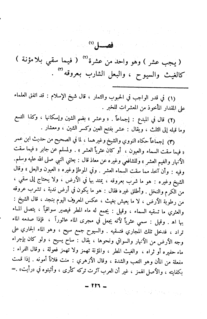 (¬3) إجماعًا حكاه النووي والشيخ وغيرهما، لما في الصحيح من حديث ابن عمر «فما سقت السماء والعيون، أو كان عثريًا العشر» . ولمسلم عن جابر «فيما سقت الأنهار والغيم العشر» وللشافعي وغيره عن معاذ قال: بعثني النبي صلى الله عليه وسلم وفيه: وأن آخذ مما سقت السماء العشر. وفي الموطإ وغيره «العيون والبعل» وقال الشيخ وغيره: هو ما شرب بعروقه، يمتد بها في الأرض، ولا يحتاج إلى سقي، من الكرم والنخل. وأطلق غيره فقال: هو ما يكون في أرض ندية، تشرب عروقه من رطوبة الأرض، لا ما يعيش بغيث، عكس المعروف اليوم بنجد، قال الشيخ: والعثري ما تسقيه السماء، وقيل يجمع له ماء المطر فيصير سواقيًا، يتصل الماء بها. اهـ. وقيل: سمي عثريًا لأنه يجعل في مجرى الماء عاثورًا، فإذا صدمه الماء تراد، فدخل تلك المجاري فتسقيه. والسيوح جمع سيح، وهو الماء الجاري على وجه الأرض من الأنهار والسواقي ونحوها، يقال: ساح يسيح، ولو كان بإجراء ماء حفيره أو ثراه، والغيث المطر، والمؤنة تهمز ولا تهمز فعولة، وقال الفراء: مفعلة من المأن وهو التعب والشدة، وقال الأزهري: منت فلانًا أمونة. إذا قمت بكفايته، والأصل الهمز، غير أن العرب آثرت تركه كأرى، وأثبتوه في «رأيت» . ولا يؤثر مؤنة حفر الأنهار والسواقي. وتنقيتها وسقي، في نقص الزكاة، لقلة المؤنة، وكذا من يحول الماء في السواقي، لأنه لا بد منه، وكحرث الأرض.