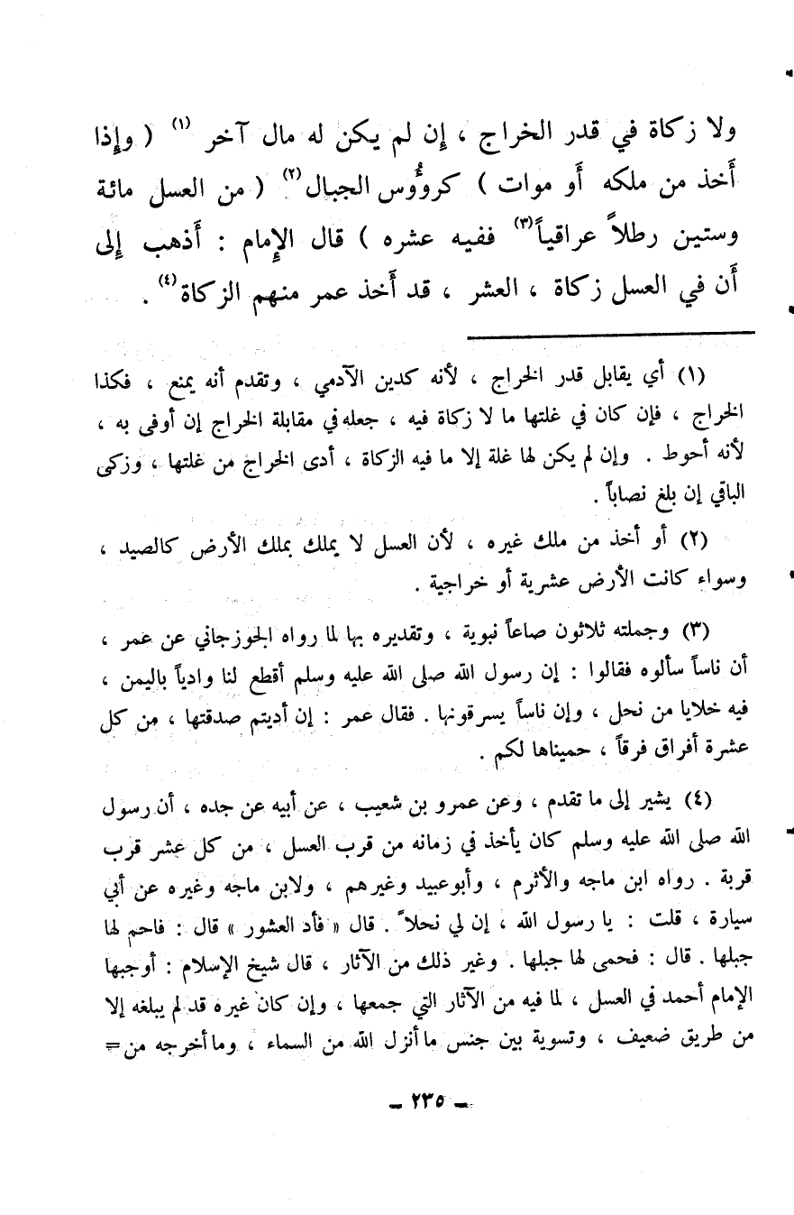 (¬4) يشير إلى ما تقدم، وعن عمرو بن شعيب، عن أبيه عن جده، أن رسول الله صلى الله عليه وسلم كان يأخذ في زمانه من قرب العسل، من كل عشر قرب قربة. رواه ابن ماجه والأثرم، وأبو عبيد وغيرهم، ولابن ماجه وغيره عن أبي سيارة، قلت: يا رسول الله، إن لي نحلاً. قال «فأد العشور» قال: فاحم لها جبلها. قال: فحمى لها جبلها. وغير ذلك من الآثار، قال شيخ الإسلام: أوجبها الإمام أحمد في العسل، لما فيه من الآثار التي جمعها، وإن كان غيره قد لم يبلغه إلا من طريق ضعيف، وتسوية بين جنس ما أنزل الله من السماء، وما أخرجه من الأرض. ولما رجع أن المعتبر في الخارج من الأرض الإدخار، قال: ولهذا تجب الزكاة عندنا في العسل، وهو رطب، ولا يوسق لكونه يبقى ويدخر. اهـ. ولأن العسل مأكول، متولد من الشجر، يكال ويدخر، فأشبه التمر، وقال المجد: القياس عدم الوجوب، لولا الآثار.