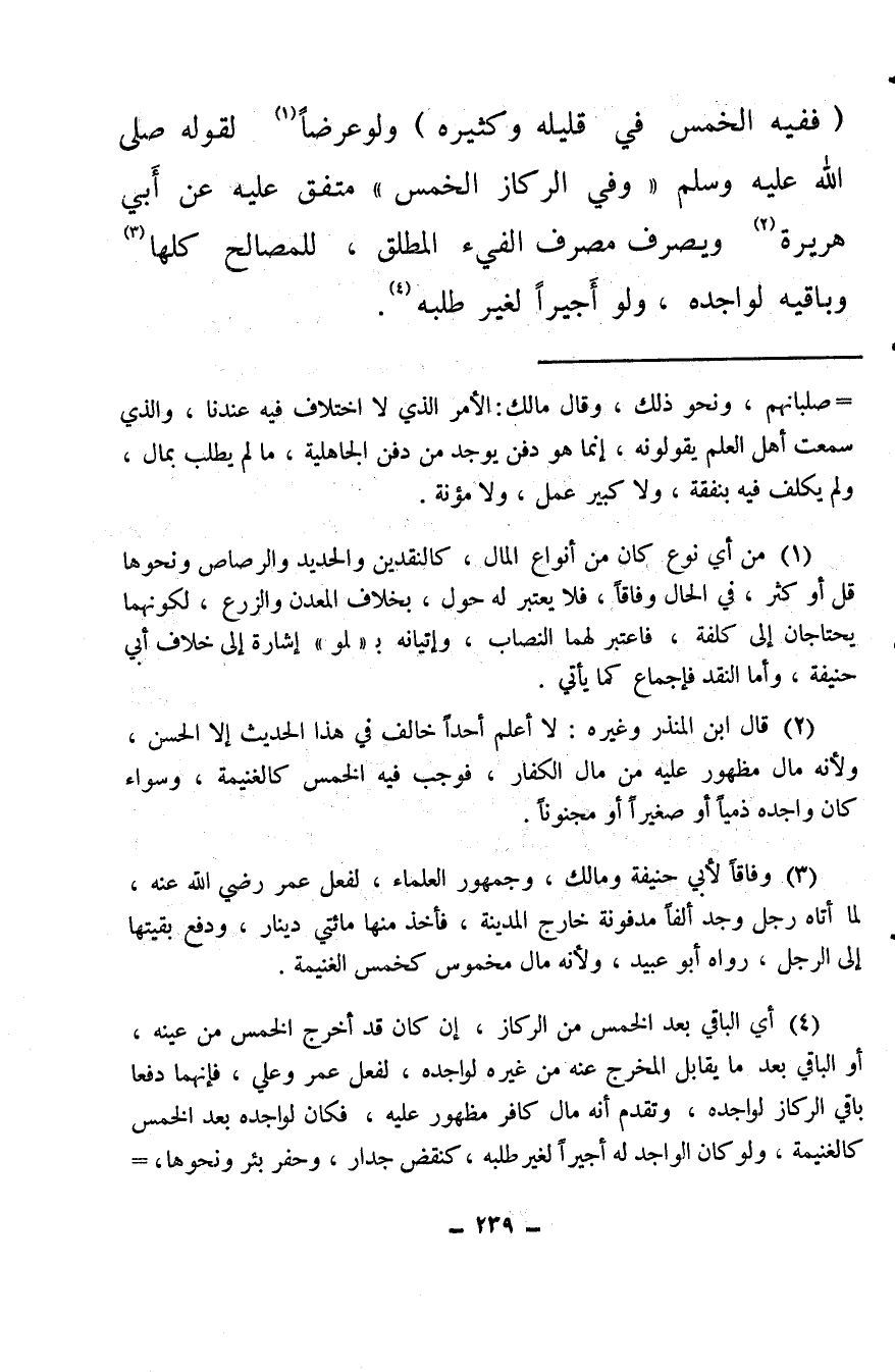 (¬3) وفاقًا لأبي حنيفة ومالك، وجمهور العلماء، لفعل عمر رضي الله عنه، لما أتاه رجل وجد ألفًا مدفونة خارج المدينة، فأخذ منها مائتي دينار، ودفع بقيتها إلى الرجل، رواه أبو عبيد، ولأنه مال مخموس كخمس الغنيمة.