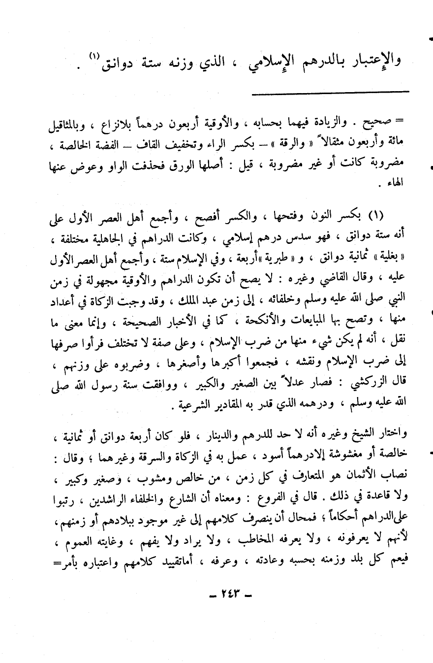 واختار الشيخ وغيره أنه لا حد للدرهم والدينار، فلو كان أربعة دوانق أو ثمانية، خالصة أو مغشوشة إلا درهمًا أسود، عمل به في الزكاة والسرقة وغيرهما؛ وقال: نصاب الأثمان هو المتعارف في كل زمن، من خالص ومشوب، وصغير وكبير، ولا قاعدة في ذلك. قال في الفروع: ومعناه أن الشارع والخلفاء الراشدين، رتبوا على الدراهم أحكامًا؛ فمحال أن ينصرف كلامهم إلى غير موجود ببلادهم أو زمنهم، لأنهم لا يعرفونه، ولا يعرفه المخاطب، ولا يراد ولا يفهم، وغايته العموم، فيعم كل بلد وزمنه بحسبه وعادته، وعرفه، أما تقييد كلامهم واعتباره بأمر حادث خاصة، غير موجود ببلادهم وزمنهم، من غير دليل كيف يمكن، وقال أحمد: قد اصطلح الناس على دراهمنا ودنانيرنا هذه، لا اختلاف فيها.