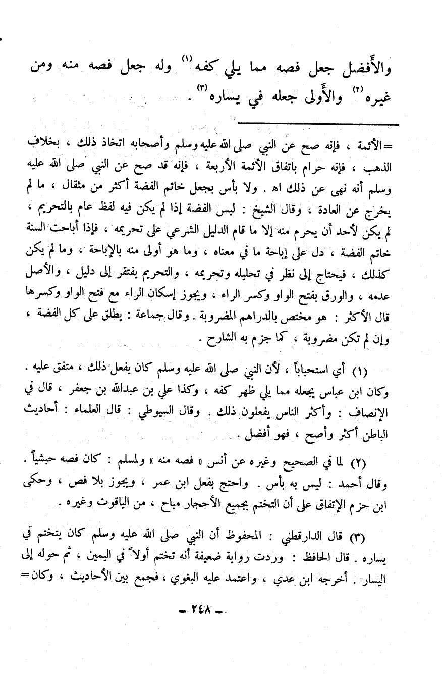 (¬3) قال الدارقطني: المحفوظ أن النبي صلى الله عليه وسلم كان يتختم في يساره. قال الحافظ: وردت رواية ضعيفة أنه تختم أولاً في اليمين، ثم حوله إلى اليسار. أخرجه ابن عدي، واعتمد عليه البغوي، فجمع بين الأحاديث، وكان