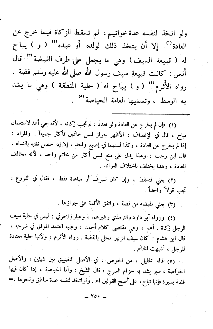 (¬4) ورواه أبو داود والترمذي وغيرهما، وعبارة الخرقي: لبيس في حلية سيف الرجل زكاة. أعم، وهي مقتضى كلام أحمد، وعليه اعتمد الموفق في شرحه، قال ابن هشام: كان سيف الزبير محلى بالفضة. رواه الأثرم، ولأنها حلية معتادة للرجل، أشبهت الخاتم.