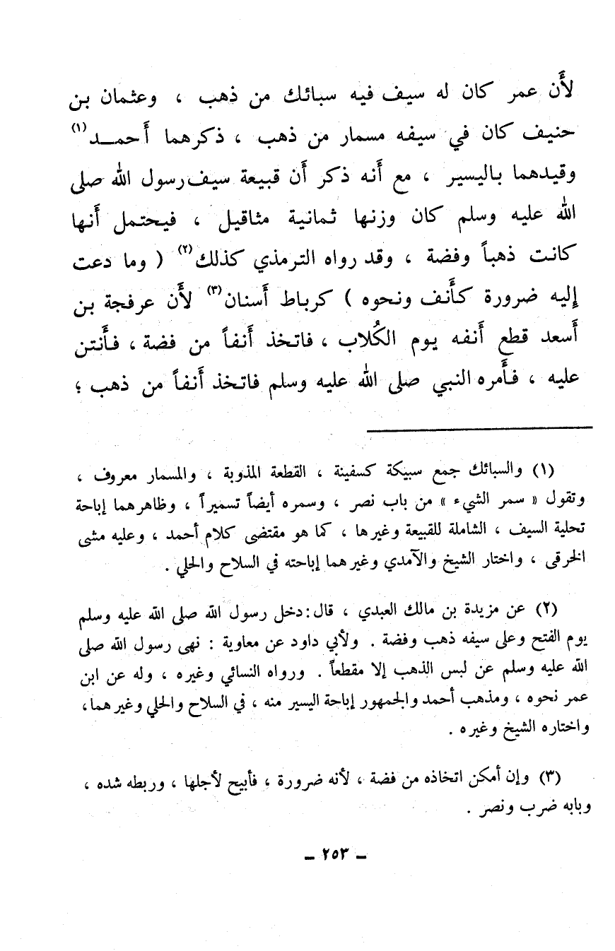 (¬1) والسبائك جمع سبيكة كسفينة، القطعة المذوبة، والمسمار معروف، وتقول «سمر الشيء» من باب نصر، وسمره أيضًا تسميرًا، وظاهرهما إباحة تحلية السيف، الشاملة للقبيعة وغيرها، كما هو مقتضى كلام أحمد، وعليه مشى الخرقي، واختار الشيخ والآمدي وغيرهما إباحته في السلاح والحلي.