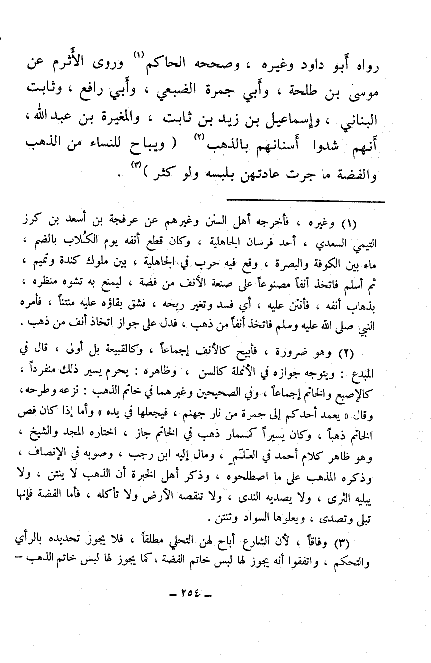 (¬1) وغيره، فأخرجه أهل السنن وغيرهم من عرفجة بن أسعد بن كرز التيمي السعدي، أحد فرسان الجاهلية، وكان قطع أنفه يوم الكُلاب بالضم، ماء بين الكوفة والبصرة، وقع فيه حرب في الجاهلية، بين ملوك كندة وتميم، ثم أسلم فاتخذ أنفًا مصنوعًا على صنعة الأنف من فضة، ليمنع به تشوه منظره، بذهاب أنفه، فأنتن عليه، أي فسد وتغير ريحه، فشق بقاؤه عليه منتنًا، فأمره النبي صلى الله عليه وسلم فاتخذ أنفًا من ذهب، فدل على جواز اتخاذ أنف من ذهب.