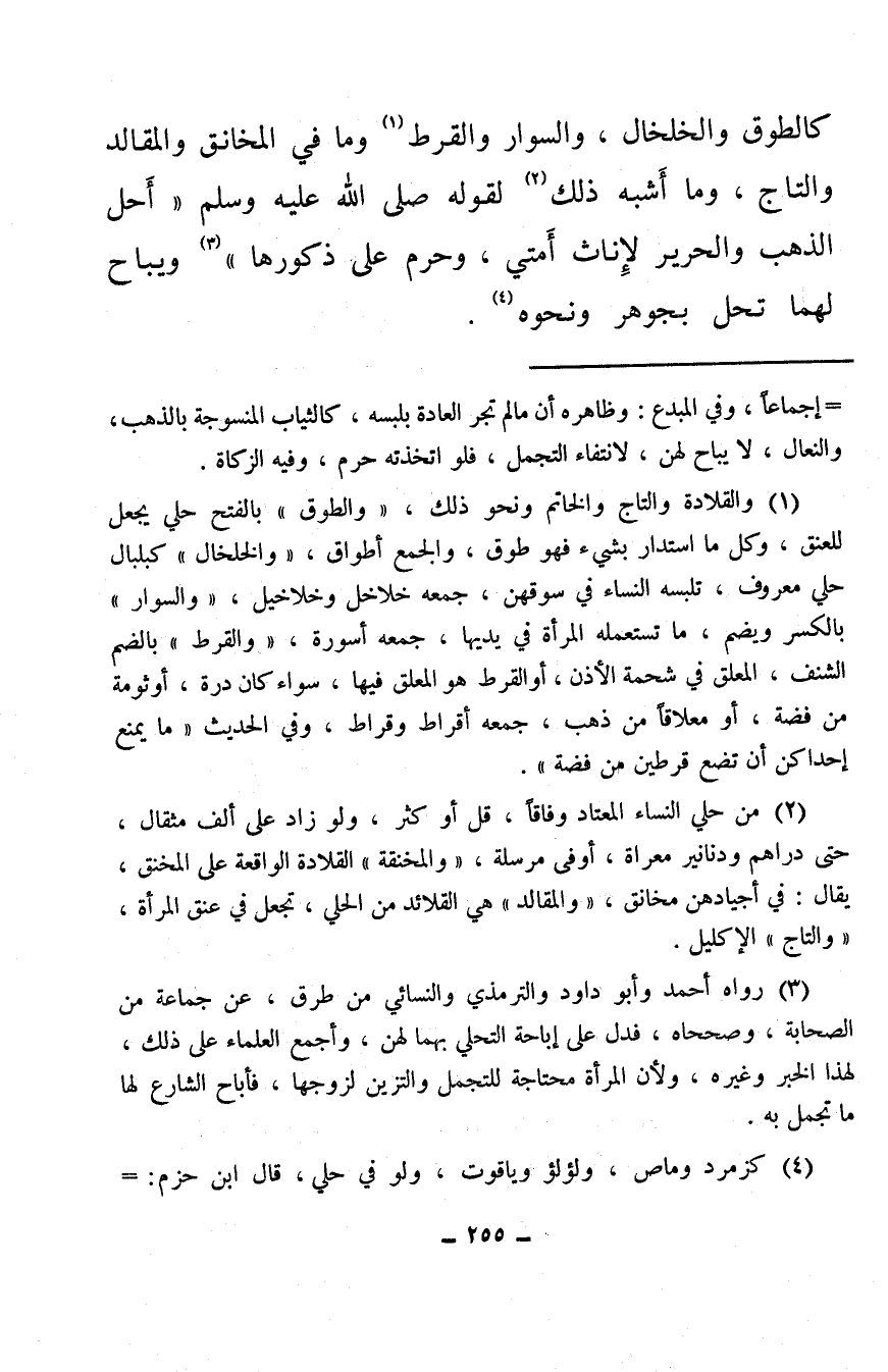 (¬3) رواه أحمد وأبو داود والترمذي والنسائي من طرق، عن جماعة من الصحابة، وصححاه، فدل على إباحة التحلي بهما لهن، وأجمع العلماء على ذلك، لهذا الخبر وغيره، ولأن المرأة محتاجة للتجمل والتزين لزوجها، فأباح الشارع لها ما تجمل به.