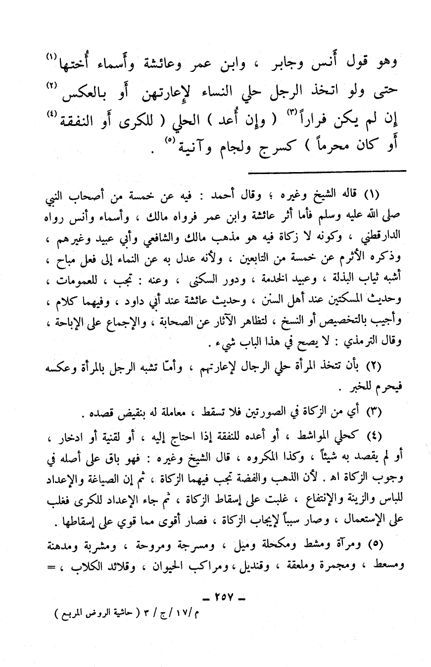 وهو قول أنس وجابر، وابن عمر وعائشة وأسماء أُختها (¬1) حتى ولو اتخذ الرجل حلي النساء لإعارتهن أو بالعكس (¬2) إن لم يكن فرارًا (¬3) (وإن أُعد) الحلي (للكرى أو النفقة (¬4) أو كان محرمًا) كسرج ولجام وآنية (¬5) .