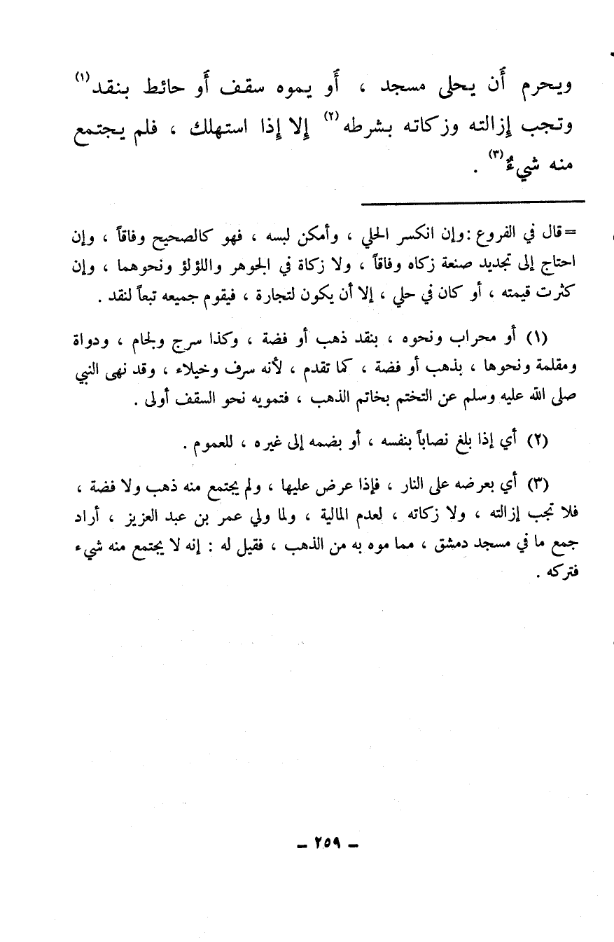 ويحرم أن يحلى مسجد، أو يموه سقف أو حائط بنقد (¬1) وتجب إزالته وزكاته بشرطه (¬2) إلا إذا استهلك، فلم يجتمع منه شيٌ (¬3) .