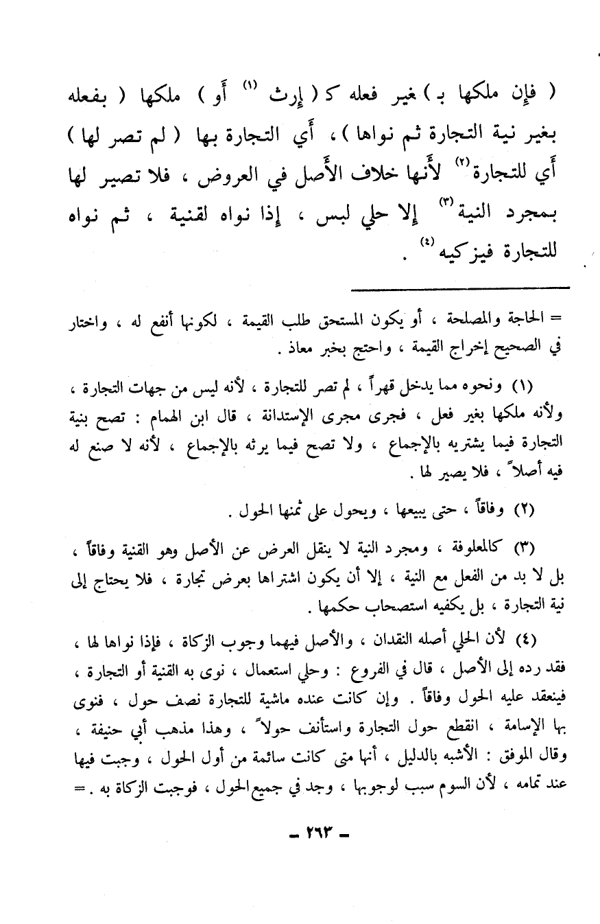 (¬3) كالمعلوفة، ومجرد النية لا ينقل العرض عن الأصل وهو القنية وفاقًا، بل لا بد من الفعل من النية، إلا أن يكون اشتراها بعرض تجارة، فلا يحتاج إلى نية التجارة، بل يكفيه استصحاب حكمها.