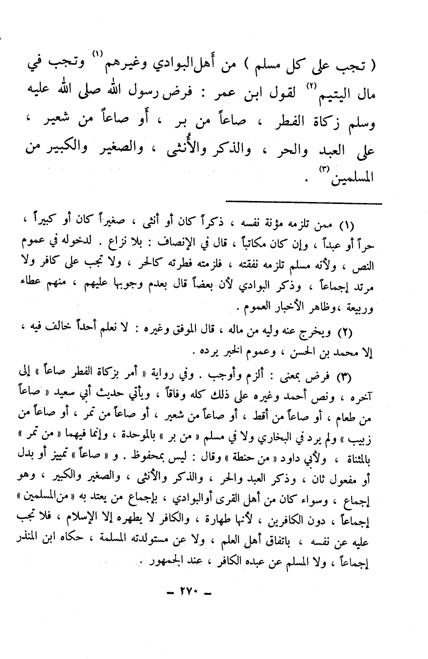 و «صاعًا» تمييز أو بدل أو مفعول ثان، وذكر العبد والحر، والذكر والأنثى، والصغير والكبير وهو إجماع، وسواء كان من أهل القرى أو البوادي، بإجماع من يعتد به «من المسلمين» إجماعًا، دون الكافرين، لأنها طهارة، والكافر لا يطهره إلا الإسلام، فلا تجب عليه عن نفسه، باتفاق أهل العلم، ولا عن مستولدته المسلمة، حكاه ابن المنذر إجماعًا، ولا المسلم عن عبده الكافر، عند الجمهور.