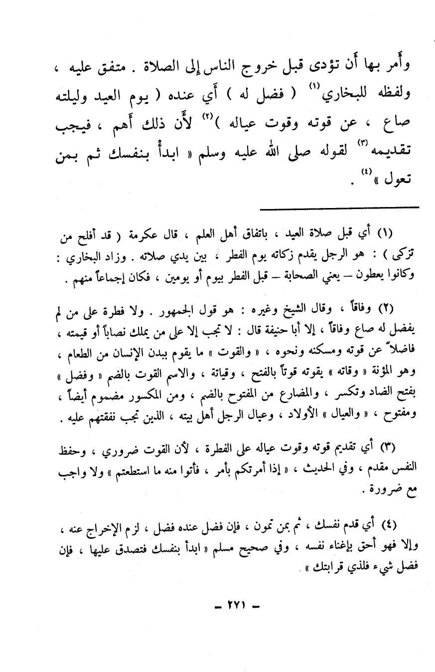 وأمر بها أن تؤدى قبل خروج الناس إلى الصلاة. متفق عليه، ولفظه للبخاري (¬1) (فضل له) أي عنده (يوم العيد وليلته صاع، عن قوته وقوت عياله) (¬2) لأن ذلك أهم، فيجب تقديمه (¬3) لقوله صلى الله عليه وسلم «ابدأ بنفسك ثم بمن تعول» (¬4) .