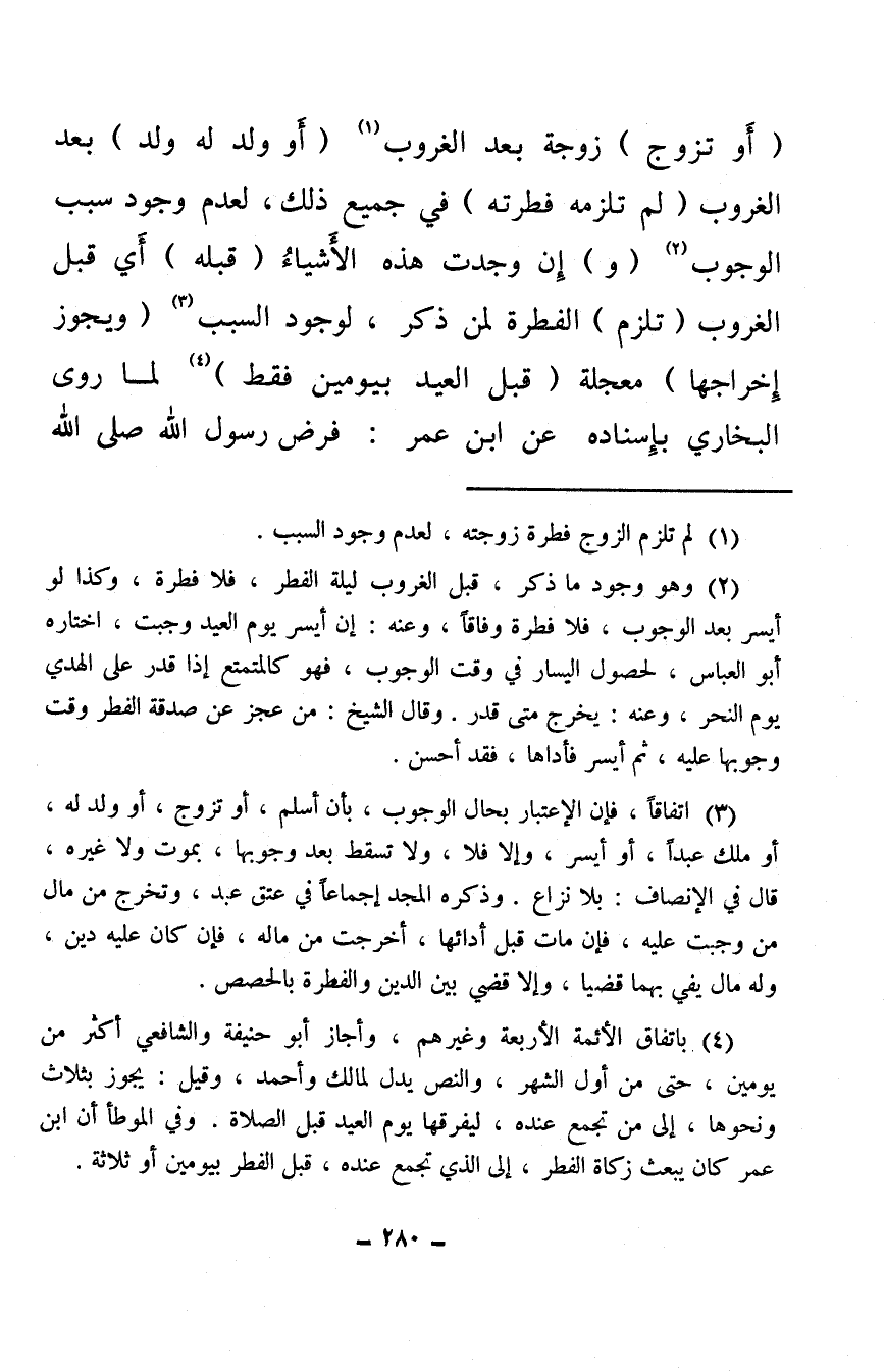 (أو تزوج) زوجة بعد الغروب (¬1) (أو ولد له ولد) بعد الغروب (لم تلزمه فطرته) في جميع ذلك، لعدم وجود سبب الوجوب (¬2) (و) إن وجدت هذه الأشياء (قبله) أي قبل الغروب (تلزم) الفطرة لمن ذكر، لوجود السبب (¬3) (ويجوز إخراجها) معجلة (قبل العيد بيومين فقط) (¬4) لما روى البخاري بإسناده عن ابن عمر: فرض رسول الله صلى الله عليه وسلم