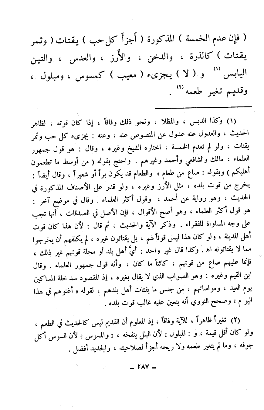 (¬1) وكذا الدبس، والمظلا، ونحو ذلك وفاقًا، إذا كان قوته، لظاهر الحديث، والعدول عنه عدول عن المنصوص عنه، وعنه: يجزئ كل حب وثمر يقتات، ولو لم تعدم الخمسة، اختاره الشيخ وغيره، وقال: هو قول جمهور العلماء، مالك والشافعي وأحمد وغيرهم. واحتج بقوله {مِنْ أَوْسَطِ مَا تُطْعِمُونَ أَهْلِيكُمْ} وبقوله «صاع من طعام» والطعام قد يكون برًا أو شعيرًا، وقال أيضًا: يخرج من قوت بلده، مثل الأرز وغيره، ولو قدر على الأصناف المذكورة في الحديث، وهو رواية عن أحمد، وقول أكثر العلماء. وقال في موضع آخر: هو قول أكثر العلماء، وهو أصح الأقوال، فإن الأصل في الصدقات، أنها تجب على وجه المساواة للفقراء. وذكر الآية والحديث، ثم قال: لأن هذا كان قوت أهل المدينة، ولو كان هذا ليس قوتًا لهم، بل يقتاتون غيره، لم يكلفهم أن يخرجوا مما لا يقتاتونه. اهـ. وكذا قال غير واحد: أي أهل بلد أو محلة قوتهم غير ذلك، فإنما عليهم صاع من قوتهم، كائنًا ما كان، وأنه قول جمهور العلماء. وقال ابن القيم وغيره: وهو الصواب الذي لا يقال بغيره، إذ المقصود سد خلة المساكين يوم العيد، ومواساتهم، من جنس ما يقتات أهل بلدهم، لقوله «أغنوهم في هذا اليوم» وصحح النووي أنه يتعين عليه غالب قوت بلده.