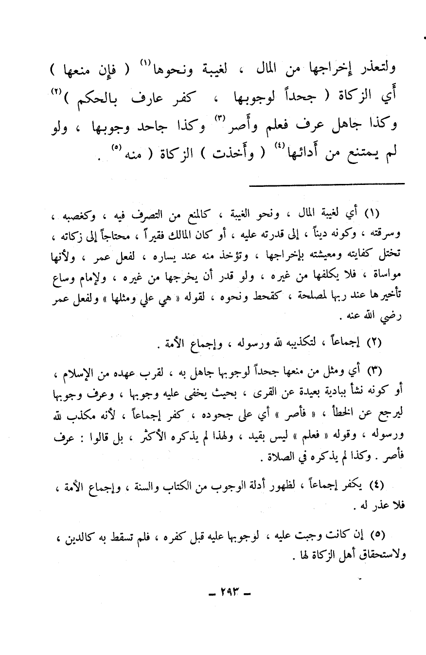 ولتعذر إخراجها من المال، لغيبة ونحوها (¬1) (فإن منعها) أي الزكاة (جحدًا لوجوبها، كفر عارف بالحكم) (¬2) وكذا جاهل عرف فعلم وأصر (¬3) وكذا جاحد وجوبها، ولو لم يمتنع من أَدائها (¬4) (وأَخذت) الزكاة (منه (¬5) .