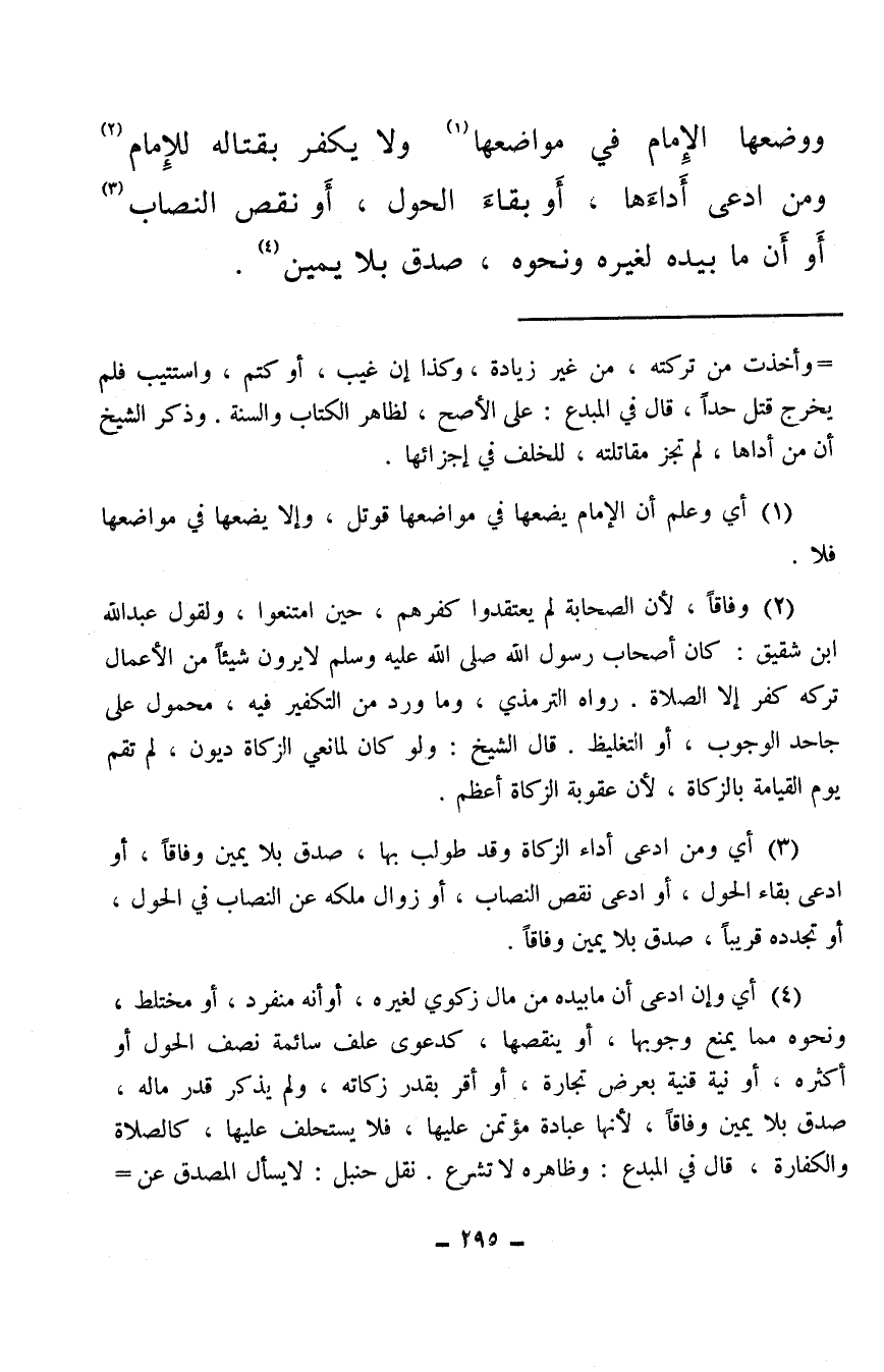 (¬2) وفاقًا، لأن الصحابة لم يعتقدوا كفرهم، حين امتنعوا، ولقول عبد الله بن شقيق: كان أصحاب رسول الله صلى الله عليه وسلم لا يرون شيئًا من الأعمال تركه كفر إلا الصلاة. رواه الترمذي، وما ورد من التكفير فيه، محمول على جاحد الوجوب، أو التغليظ. قال الشيخ: ولو كان لمانعي الزكاة ديون، لم تقم يوم القيامة بالزكاة، لأن عقوبة الزكاة أعظم.